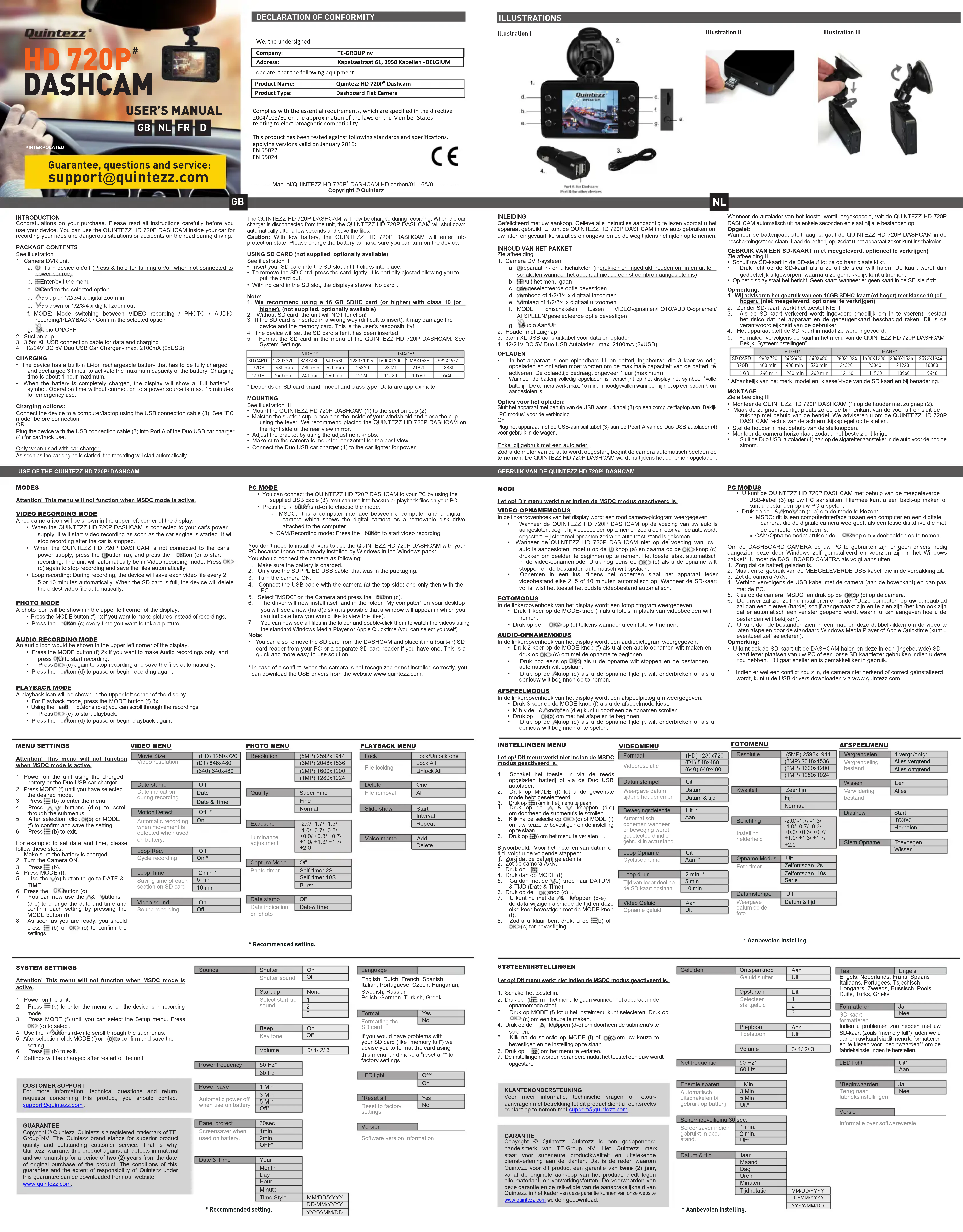 caméra. SUPPORT CLIENT Pour plus d’informations, des questions techniques ou des demandes de retour concernant ce produit, il faut contacter support@quintezz.com GARANTIE Copyright © Quintezz. Quintezz est une marque déposée de TE-Group NV. La marque Quintezz est synonyme de qualité supérieure des produits et de service clientèle d’excellence. C’est la raison pour laquelle Quintezz garantit ce produit contre tout défaut matériel et de main-d’œuvre pendant une période de deux (2) ans à compter de la date d’achat initiale du produit. Les conditions de cette garantie et l’étendue de la responsabilité de Quintezz dans le cadre de cette garantie peuvent être téléchargées sur notre site : www.quintezz.com