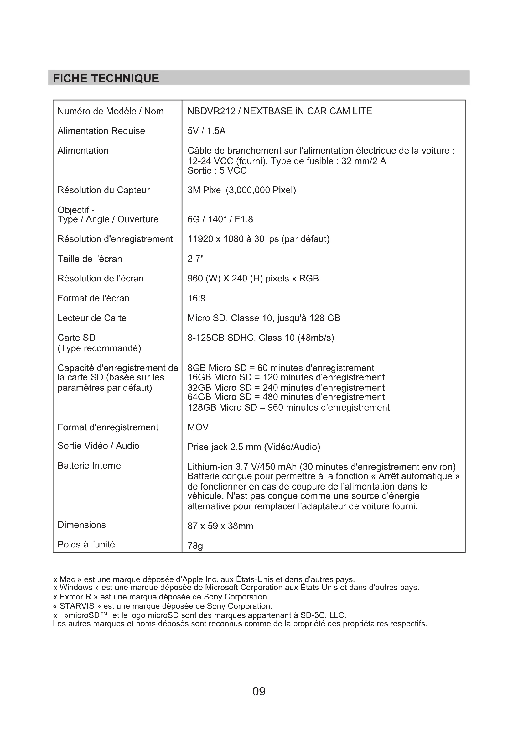 | Numéro de Modèle / Nom | NBDVR212 / NEXTBASE iN-CAR CAM LITE |