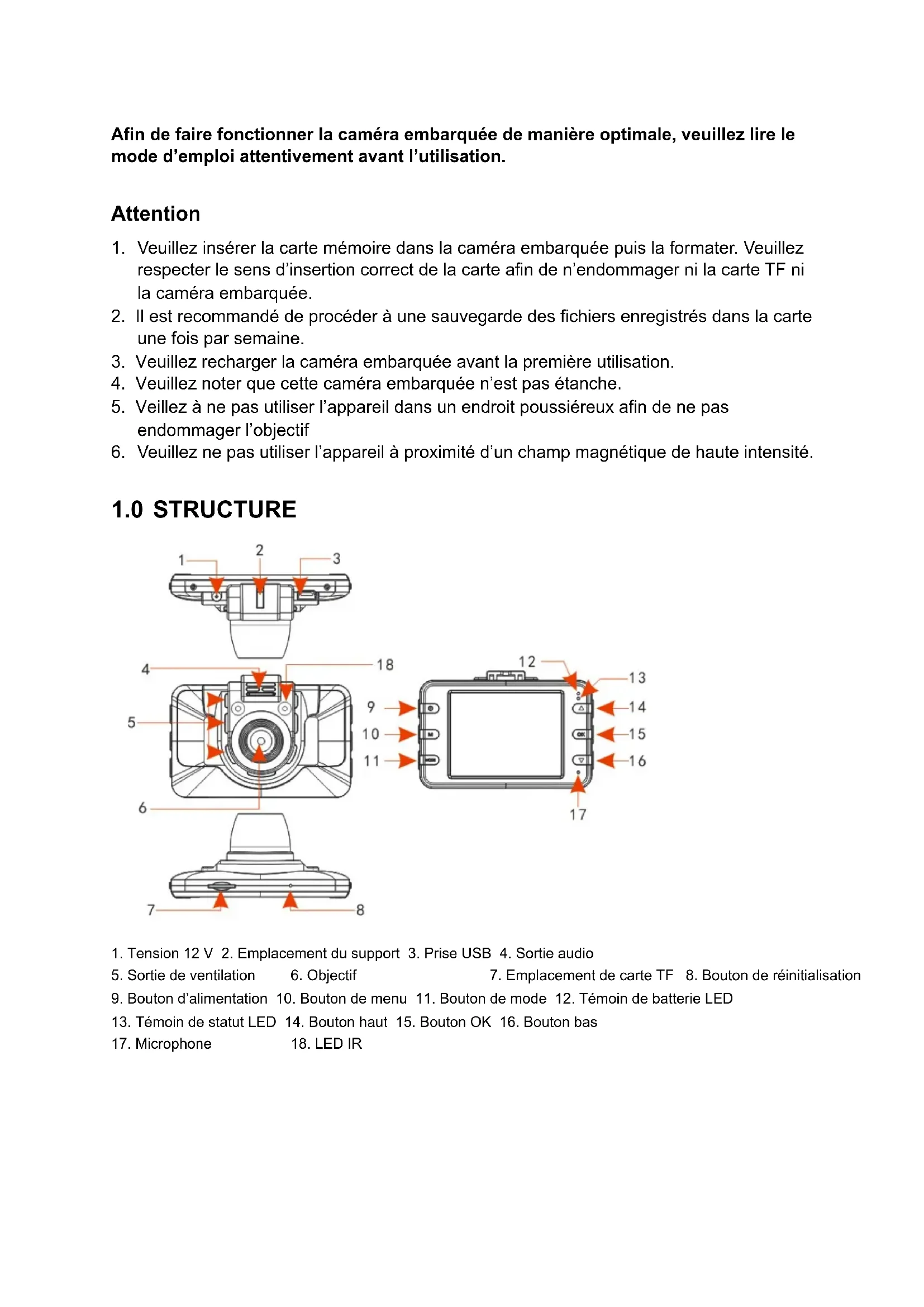 Afin de faire fonctionner la caméra embarquée de manière optimale, veuillez lire le mode d'emploi attentivement avant l'utilisation.