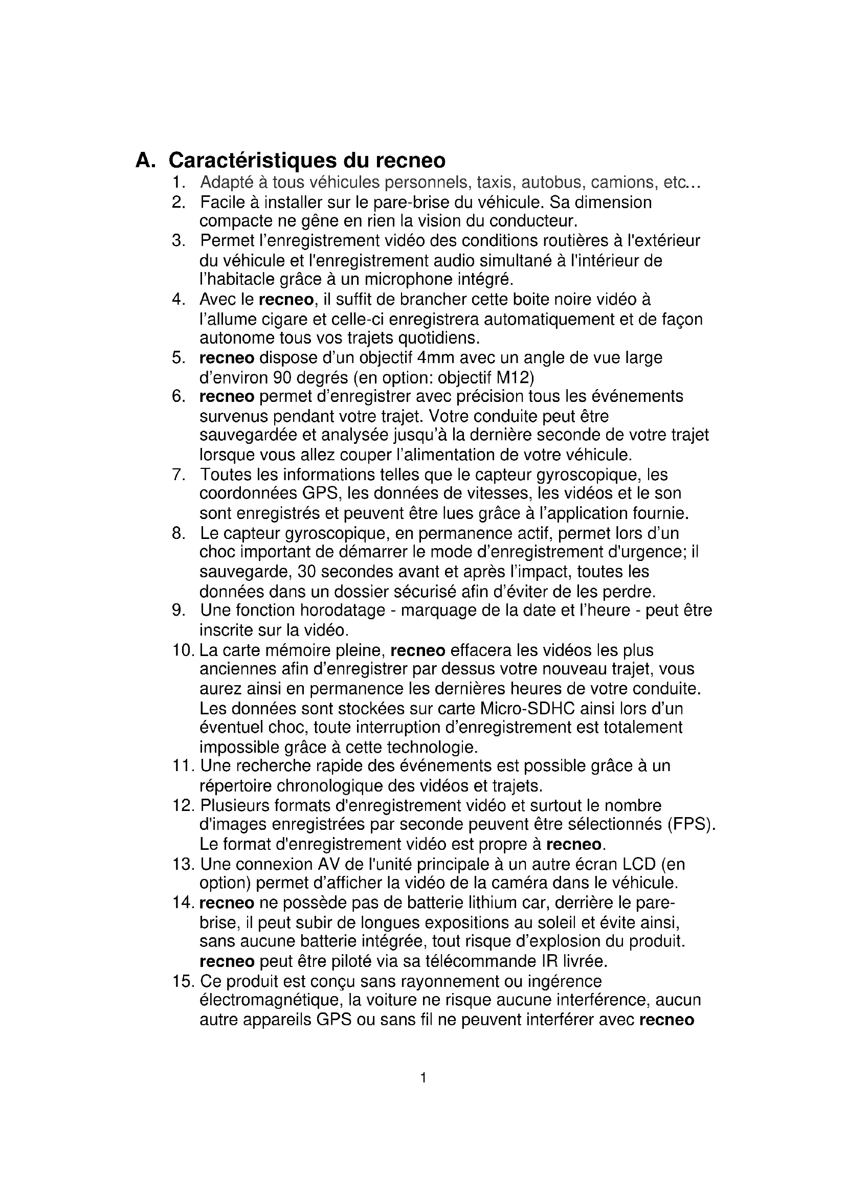 J. Formater Carte SD....................................................................................15 K. Etapes pour la mise à jour du Firmware................................................191 A. Caractéristiques du recneo