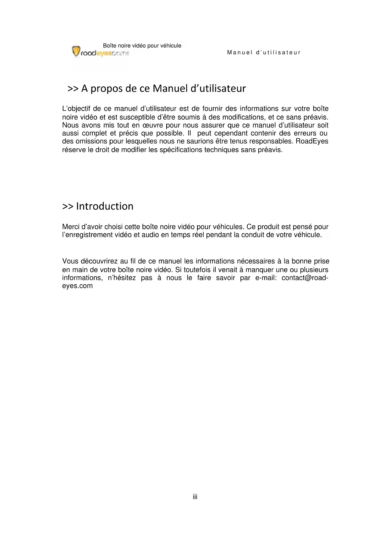 >> A propos de ce Manuel d’utilisateur L’objectif de ce manuel d’utilisateur est de fournir des informations sur votre boîte noire vidéo et est susceptible d’être soumis à des modifications, et ce sans préavis. Nous avons mis tout en œuvre pour nous assurer que ce manuel d’utilisateur soit aussi complet et précis que possible. Il peut cependant contenir des erreurs ou des omissions pour lesquelles nous ne saurions être tenus responsables. RoadEyes réserve le droit de modifier les spécifications techniques sans préavis.