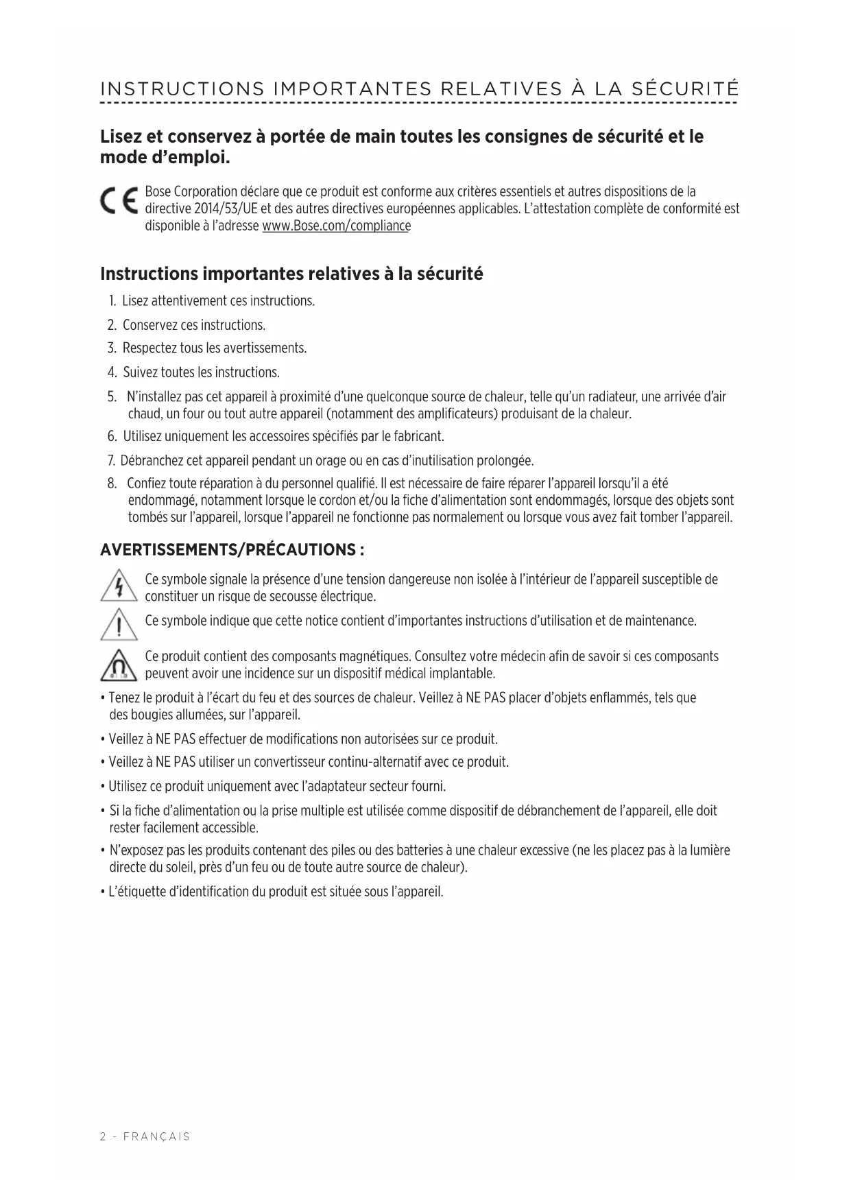 Lisez et conservez à portée de main toutes les consignes de sécurité et le mode d’emploi. Bose Corporation déclare que ce produit est conforme aux critères essentiels et autres dispositions de la directive 2014/53/UE et des autres directives européennes applicables. L’attestation complète de conformité est disponible à l’adresse www.Bose.com/compliance Instructions importantes relatives à la sécurité
