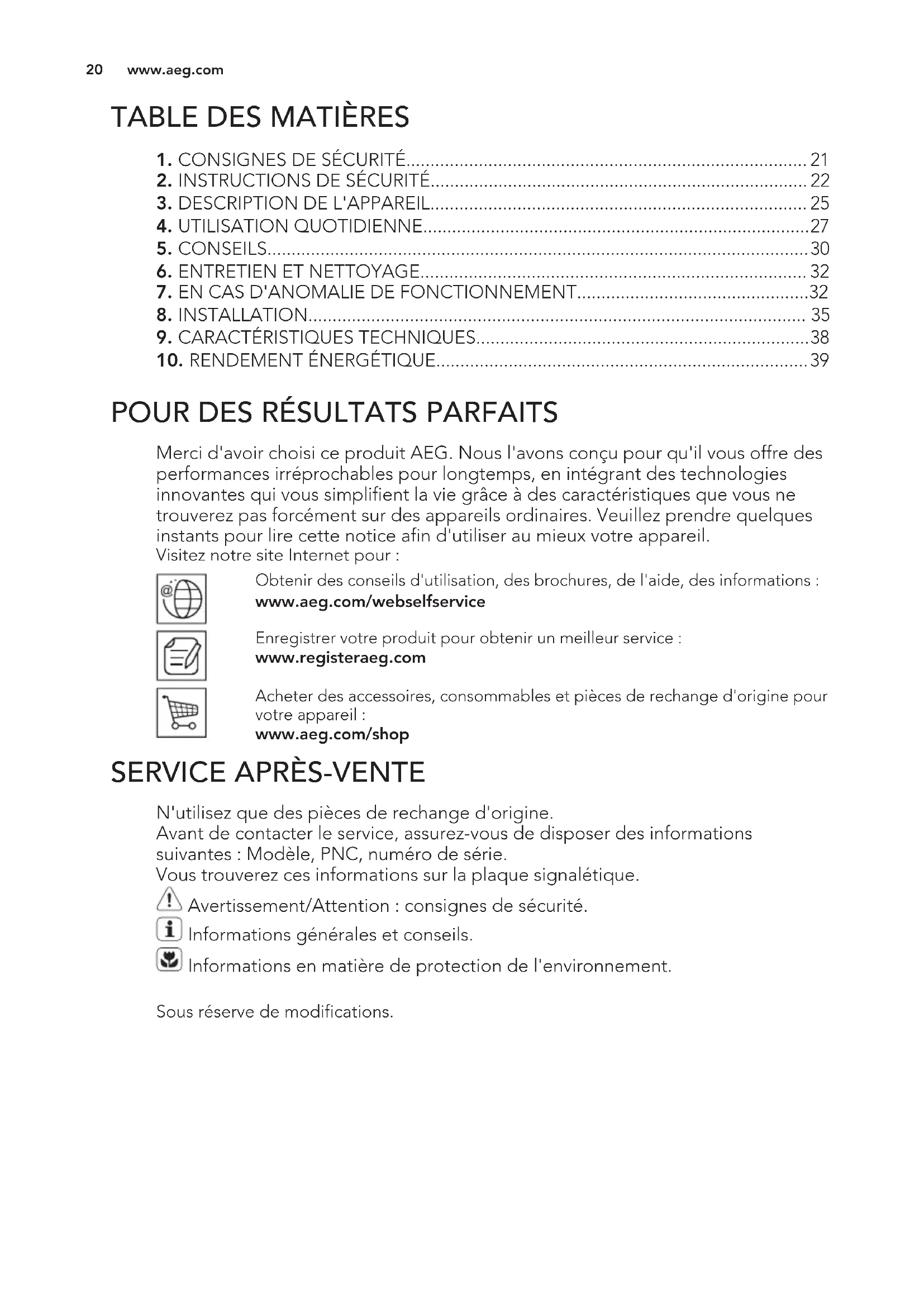 Merci d'avoir choisi ce produit AEG. Nous l'avons conçu pour qu'il vous offre des performances irréprochables pour longtemps, en intégrant des technologies innovantes qui vous simplifient la vie grâce à des caractéristiques que vous ne trouverez pas forcément sur des appareils ordinaires. Veuillez prendre quelques instants pour lire cette notice afin d'utiliser au mieux votre appareil. Visitez notre site Internet pour : Obtenir des conseils d'utilisation, des brochures, de l'aide, des informations : www.aeg.com/webselfservice Enregistrer votre produit pour obtenir un meilleur service : www.registeraeg.com Acheter des accessoires, consommables et pièces de rechange d'origine pour votre appareil : www.aeg.com/shop