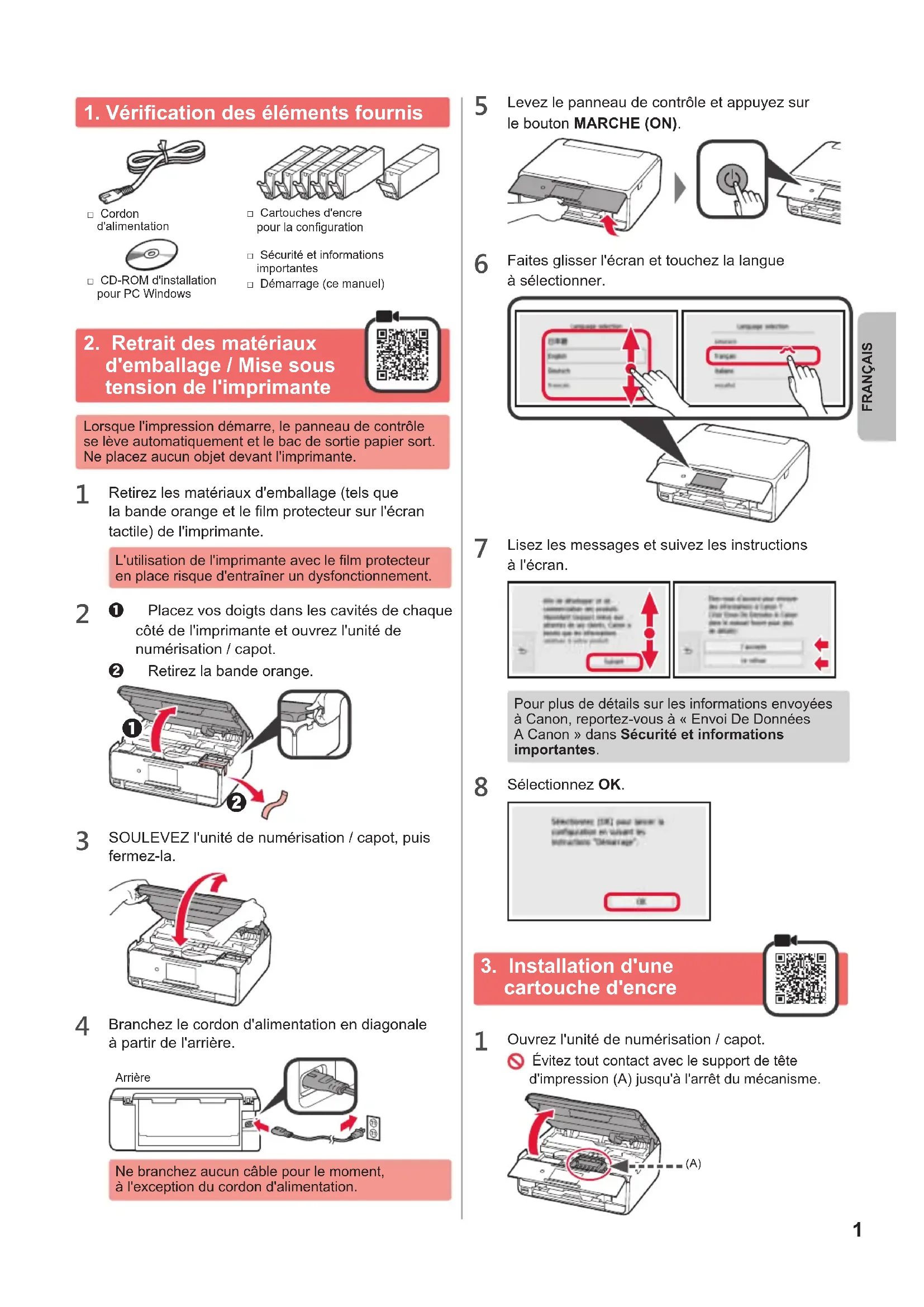 □ CD-ROM d'installation pour PC Windows□ Cordon d'alimentation□ Sécurité et informations importantes□ Cartouches d'encre pour la conguration□ Démarrage (ce manuel)