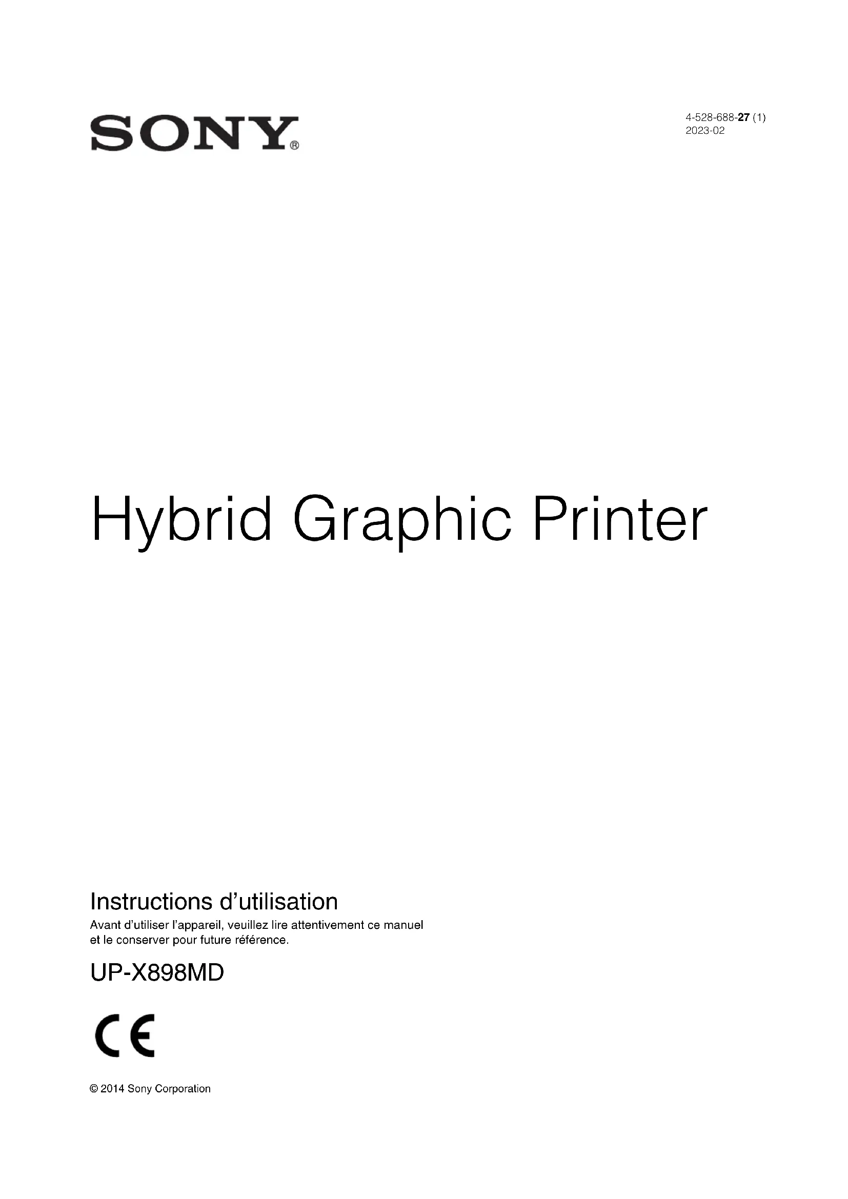 Instructions d’utilisation Avant d’utiliser l’appareil, veuillez lire attentivement ce manuel et le conserver pour future référence. UP-X898MD © 2014 Sony Corporation Hybrid Graphic Printer 4-528-688-27 (1) 2023-022 Indications d’utilisation/Utilisation prévue L’imprimante Sony UP-X898MD est une imprimante noir et blanc compacte destinée au secteur médical et conçue pour être reliée à des systèmes d’imagerie radiologique analogique et/ou numérique tels qu’un laboratoire de cathétérisme cardiaque, à ultrasons, avec arceau mobile ou d’autres systèmes d’imagerie médicale compatibles. Cette imprimante produit des copies papier d’images fixes capturées par le système d’imagerie qui servent de copies de référence pour le dossier du patient ou pour son orientation. Remarques