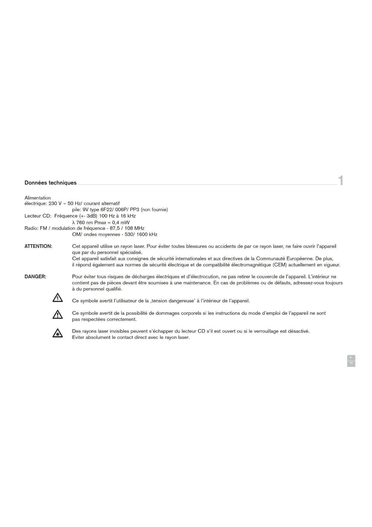 1 D*F*NL*GR 06.08.2003 10:02 Uhr Seite 13Données techniques Alimentation électrique: 230 V ~ 50 Hz/ courant alternatif pile: 9V type 6F22/ 006P/ PP3 (non fournie) Lecteur CD: Fréquence (+- 3dB) 100 Hz à 16 kHz Ï 760 nm Pmax = 0,4 mW Radio: FM / modulation de fréquence - 87,5 / 108 MHz OM/ ondes moyennes - 530/ 1600 kHz ATTENTION: Cet appareil utilise un rayon laser. Pour éviter toutes blessures ou accidents de par ce rayon laser, ne faire ouvrir l’appareil que par du personnel spécialisé. Cet appareil satisfait aux consignes de sécurité internationales et aux directives de la Communauté Européenne. De plus, il répond également aux normes de sécurité électrique et de compatibilité électromagnétique (CEM) actuellement en vigueur. DANGER: Pour éviter tous risques de décharges électriques et d’électrocution, ne pas retirer le couvercle de l’appareil. L’intérieur ne contient pas de pièces devant être soumises à une maintenance. En cas de problèmes ou de défauts, adressez-vous toujours à du personnel qualifié. Ce symbole avertit l’utilisateur de la ‚tension dangereuse’ à l’intérieur de l’appareil. Ce symbole avertit de la possibilité de dommages corporels si les instructions du mode d’emploi de l’appareil ne sont pas respectées correctement. Des rayons laser invisibles peuvent s’échapper du lecteur CD s’il est ouvert ou si le verrouillage est désactivé. Eviter absolument le contact direct avec le rayon laser.