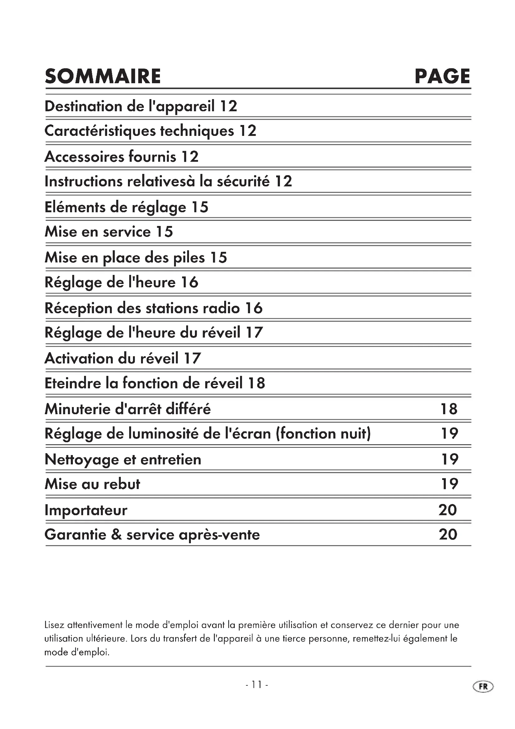 kompernass.com IB_KH2236-39_DE_LB1 12.10.2007 18:02 Uhr Seite 10SOMMAIRE PAGE Destination de l'appareil 12 Caractéristiques techniques 12 Accessoires fournis 12 Instructions relativesà la sécurité 12 Eléments de réglage 15 Mise en service 15 Mise en place des piles 15 Réglage de l'heure 16 Réception des stations radio 16 Réglage de l'heure du réveil 17 Activation du réveil 17 Eteindre la fonction de réveil 18 Minuterie d'arrêt différé 18 Réglage de luminosité de l'écran (fonction nuit) 19 Nettoyage et entretien 19 Mise au rebut 19 Importateur 20 Garantie & service après-vente 20 Lisez attentivement le mode d'emploi avant la première utilisation et conservez ce dernier pour une utilisation ultérieure. Lors du transfert de l'appareil à une tierce personne, remettez-lui également le mode d'emploi.