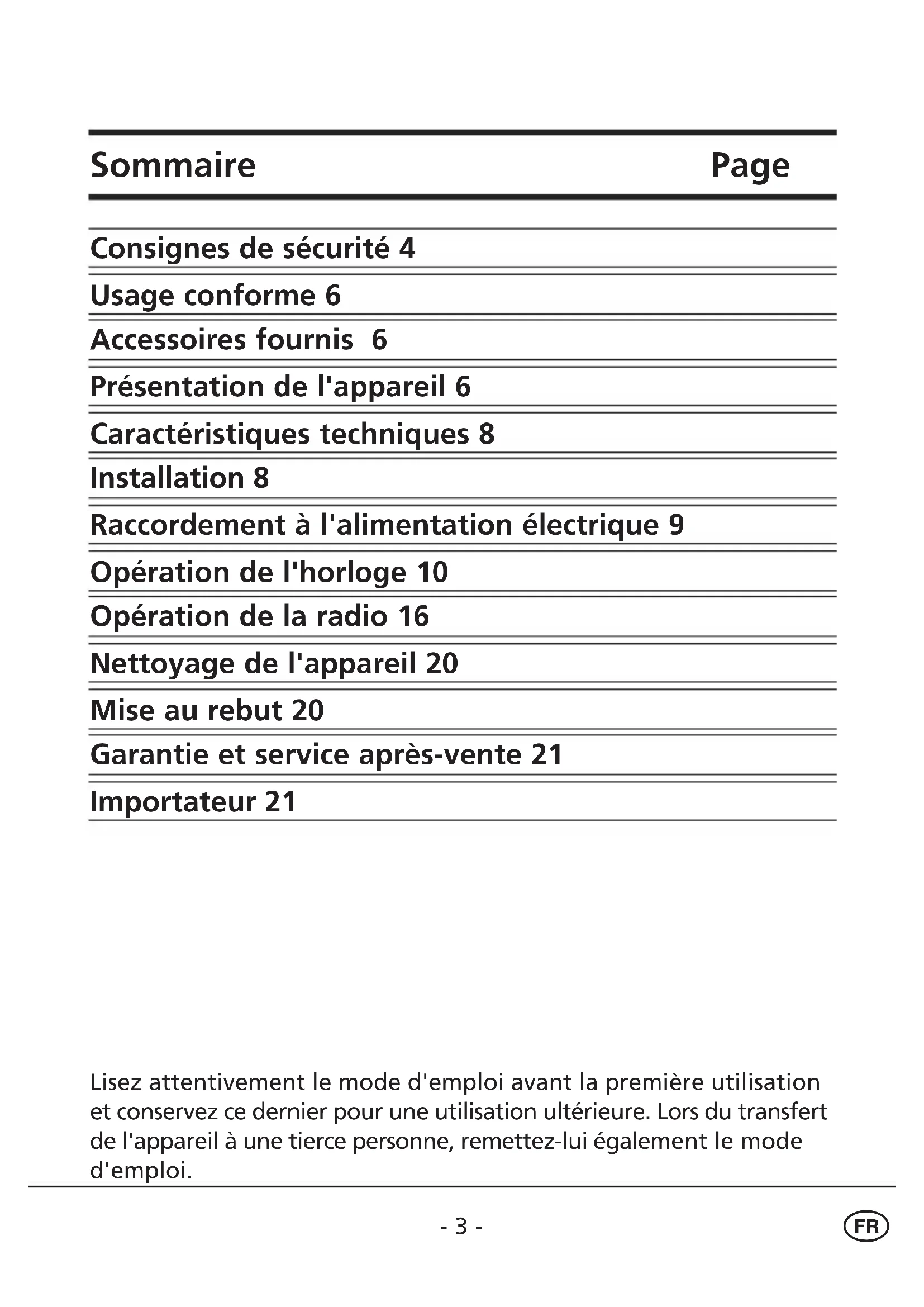 Sommaire Page Consignes de sécurité 4 Usage conforme 6 Accessoires fournis 6 Présentation de l'appareil 6 Caractéristiques techniques 8 Installation 8 Raccordement à l'alimentation électrique 9 Opération de l'horloge 10 Opération de la radio 16 Nettoyage de l'appareil 20 Mise au rebut 20 Garantie et service après-vente 21 Importateur 21 Lisez attentivement le mode d'emploi avant la première utilisation et conservez ce dernier pour une utilisation ultérieure. Lors du transfert de l'appareil à une tierce personne, remettez-lui également le mode d'emploi. IB_KH2217_E5158_W_V3.qxd 17.07.2007 8:51 Uhr Seite 3- 4 -
