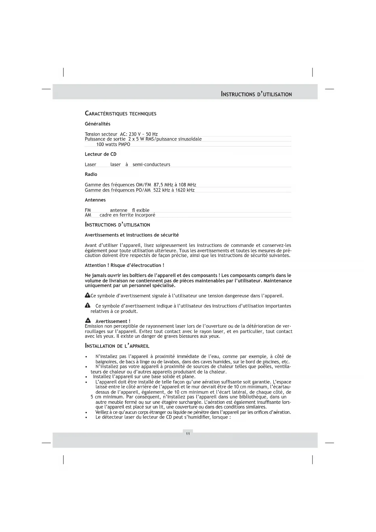 Généralités Tension secteur AC: 230 V ~ 50 Hz Puissance de sortie 2 x 5 W RMS/puissance sinusoïdale 100 watts PMPO Lecteur de CD Laser laser à semi-conducteurs Radio Gamme des fréquences OM/FM 87,5 MHz à 108 MHz Gamme des fréquences PO/AM 522 kHz à 1620 kHz Antennes FM antenne fl exible AM cadre en ferrite incorporé
