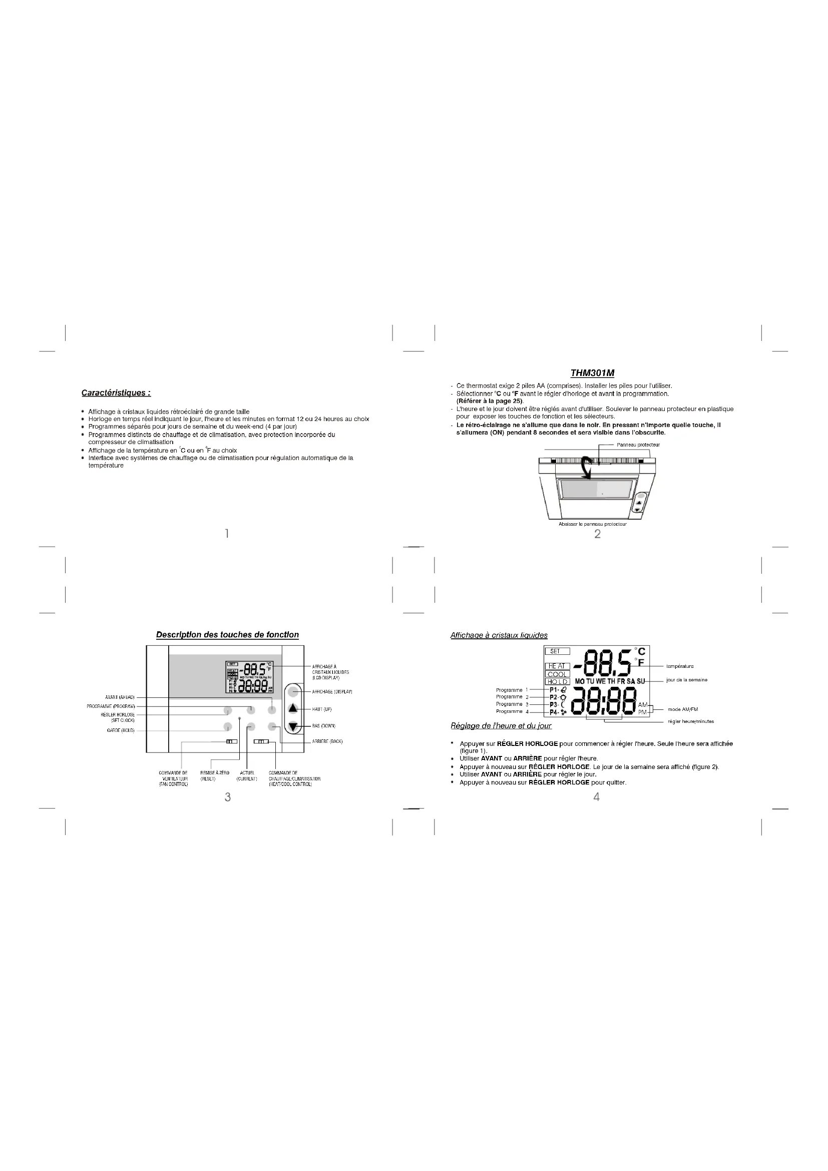 L'heure et le jour doivent être régles avant d'utiliser. Soulever le panneau protector en plastique pour exposer les touches de fonction et les selecteurs.