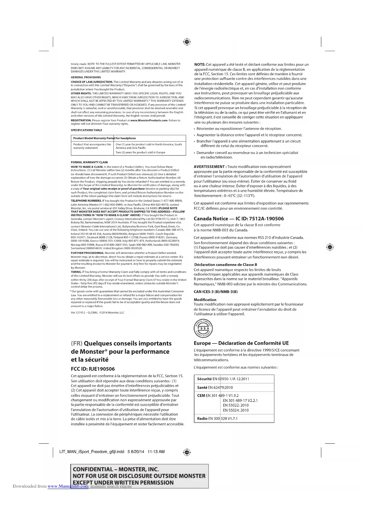 EN 301 489-17 V2.2.1 EN 55022: 2010 EN 55024: 2010 Radio EN 300 328 V1.7.1 (FR) Quelques conseils importants de Monster® pour la performance et la sécurité