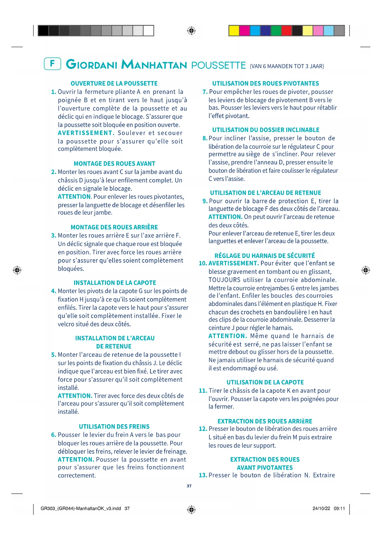 - AVERTISSEMENT: Ce produit ne convient pas pour faire du jogging ou des promenades en rollers. L'utilisation de la poussette est autorisée avec les enfants d'un age compris entre 6 et 36 mois, jusqu'à un poids maximum de 15kg. Actionner le système de freinage avant de mettre ou d'enlever l'enfant de la poussette.