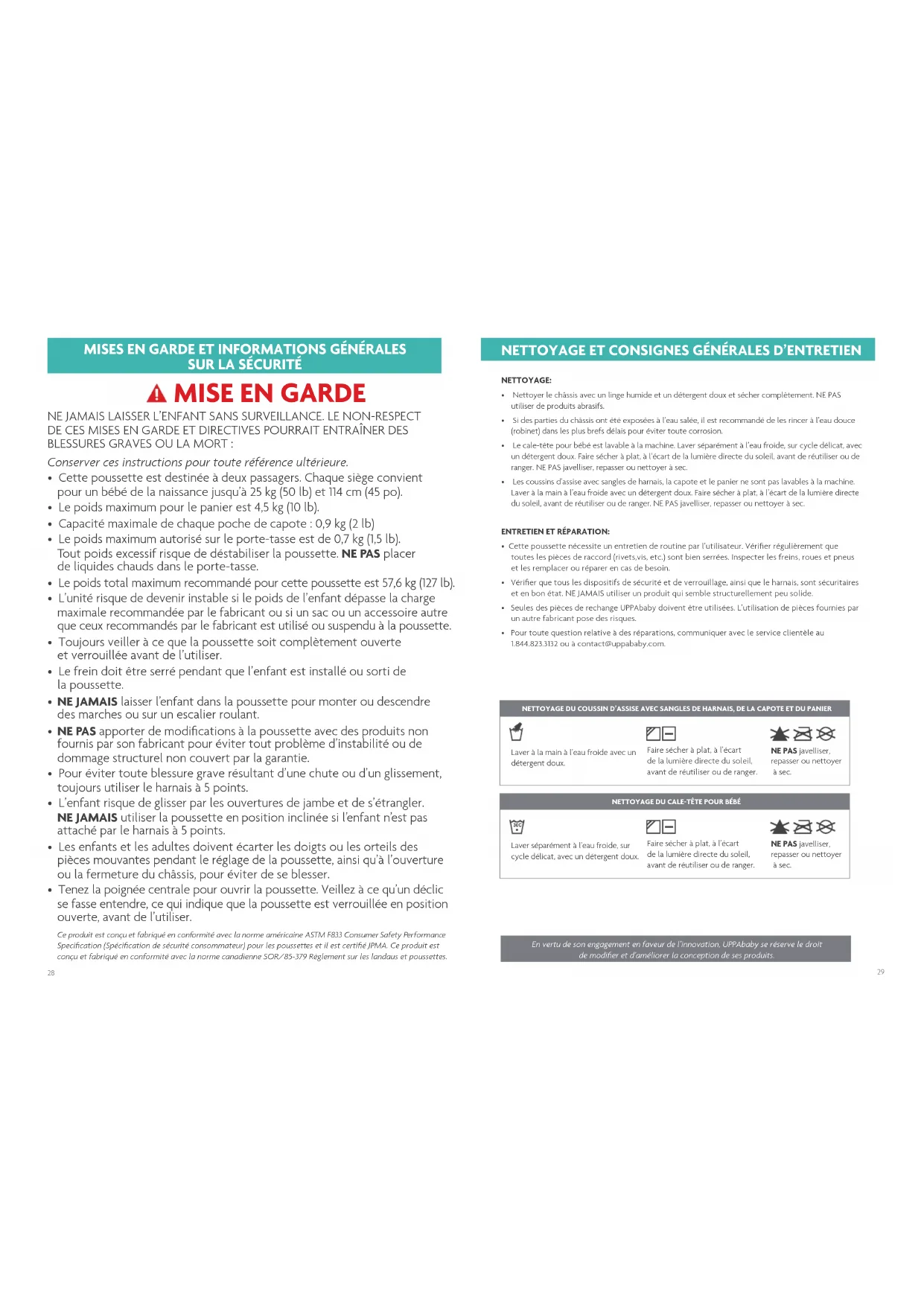 En vertu de son engagement en faveur de l’innovation, UPPAbaby se réserve le droit de modifier et d’améliorer la conception de ses produits. NETTOYAGE ET CONSIGNES GÉNÉRALES D’ENTRETIEN NETTOYAGE DU COUSSIN D’ASSISE AVEC SANGLES DE HARNAIS, DE LA CAPOTE ET DU PANIER Laver à la main à l’eau froide avec un détergent doux.