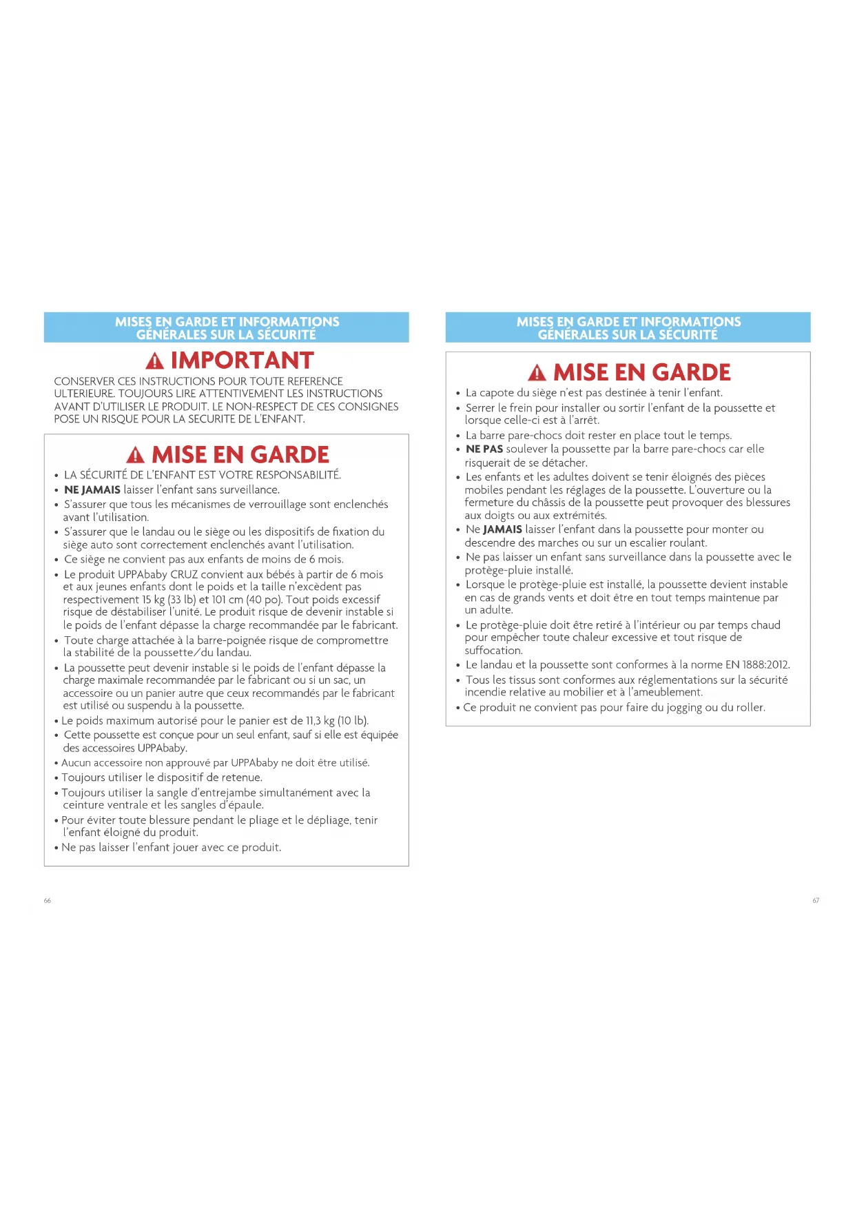 - Inspecter régulièrement la poussette CRUZ. Faire réparer dans les plus brefs délais les pièces usées ou endommagées. Vérifier que tous les dispositifs de sécurité et de verrouillage, ainsi que le harnais, sont sécuritaires et en bon état. Ne jamais utiliser une poussette qui semble structurellement peu solide.