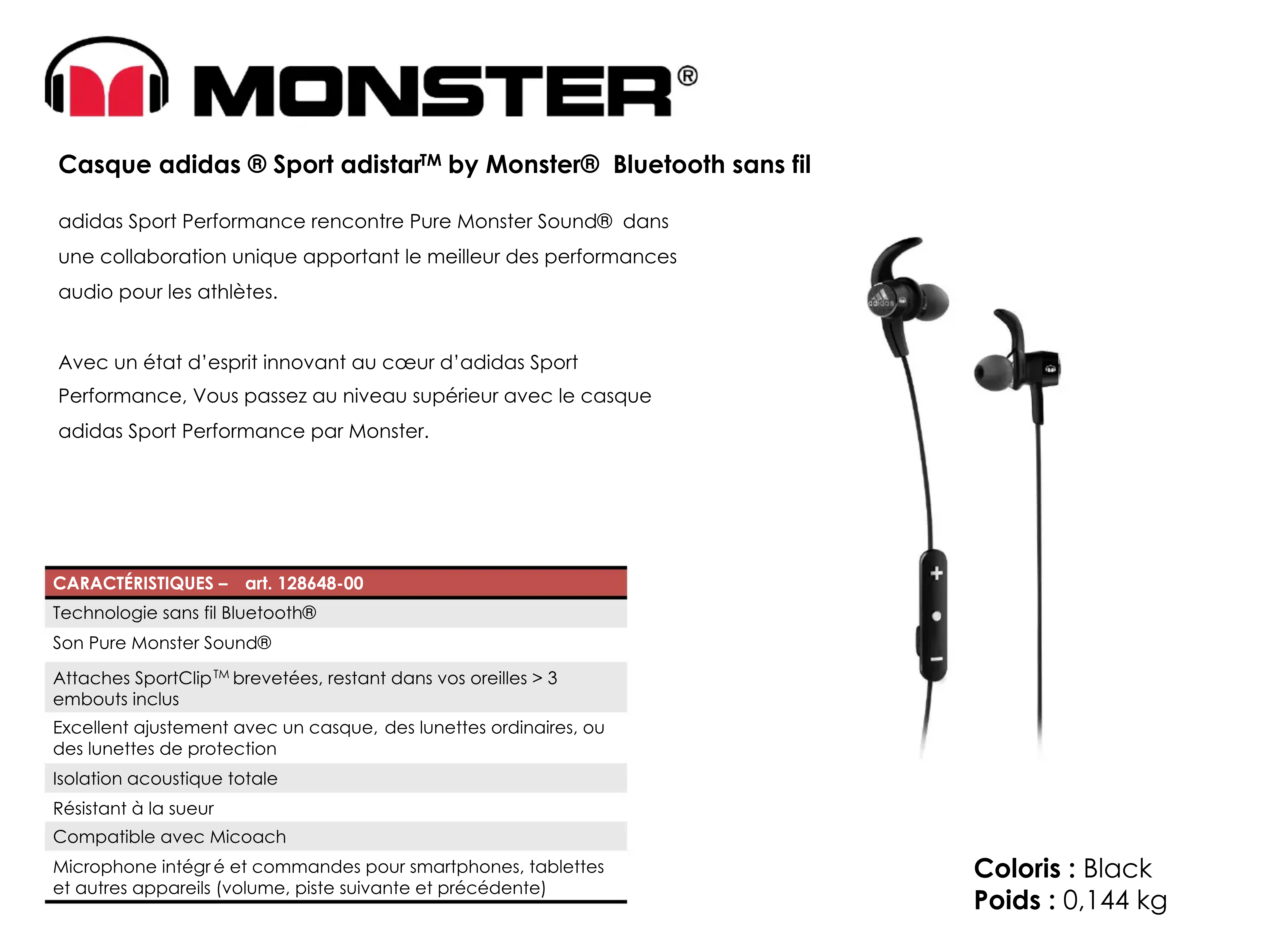 by Monster® Bluetooth sans fil adidas Sport Performance rencontre Pure Monster Sound® dans une collaboration unique apportant le meilleur des performances audio pour les athlètes. Avec un état d’esprit innovant au cœur d’adidas Sport Performance, Vous passez au niveau supérieur avec le casque adidas Sport Performance par Monster. CARACTÉRISTIQUES – art. 128648-00 Technologie sans fil Bluetooth® Son Pure Monster Sound® Attaches SportClip
