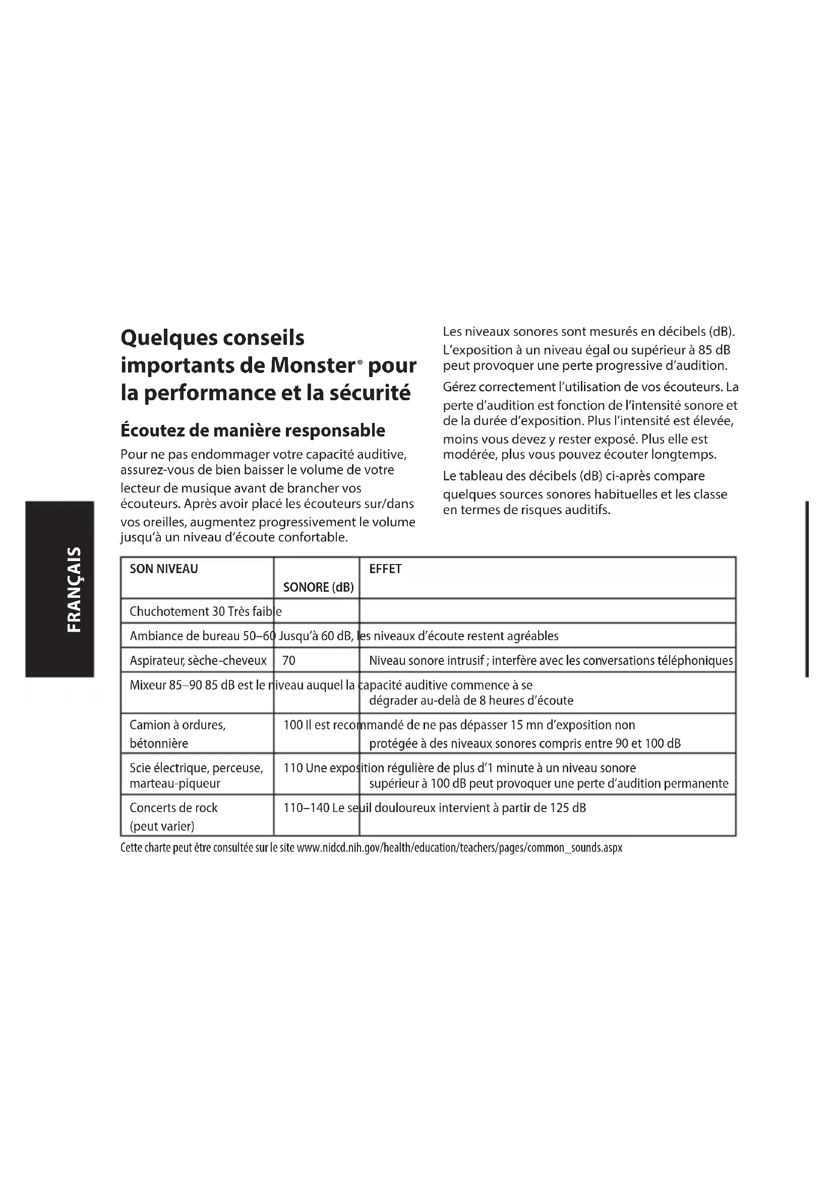 pour la performance et la sécurité Écoutez de manière responsable Pour ne pas endommager votre capacité auditive, assurez-vous de bien baisser le volume de votre lecteur de musique avant de brancher vos écouteurs. Après avoir placé les écouteurs sur/dans vos oreilles, augmentez progressivement le volume jusqu’à un niveau d’écoute confortable. Les niveaux sonores sont mesurés en décibels (dB). L’exposition à un niveau égal ou supérieur à 85 dB peut provoquer une perte progressive d’audition. Gérez correctement l’utilisation de vos écouteurs. La perte d’audition est fonction de l’intensité sonore et de la durée d’exposition. Plus l’intensité est élevée, moins vous devez y rester exposé. Plus elle est modérée, plus vous pouvez écouter longtemps. Le tableau des décibels (dB) ci-après compare quelques sources sonores habituelles et les classe en termes de risques auditifs. SON NIVEAU SONORE (dB) EFFET Chuchotement 30 Très faible Ambiance de bureau 50–60 Jusqu’à 60 dB, les niveaux d’écoute restent agréables Aspirateur, sèche-cheveux 70 Niveau sonore intrusif ; interfère avec les conversations téléphoniques Mixeur 85–90 85 dB est le niveau auquel la capacité auditive commence à se dégrader au-delà de 8 heures d’écoute Camion à ordures, bétonnière 100 Il est recommandé de ne pas dépasser 15 mn d’exposition non protégée à des niveaux sonores compris entre 90 et 100 dB Scie électrique, perceuse, marteau-piqueur 110 Une exposition régulière de plus d’1 minute à un niveau sonore supérieur à 100 dB peut provoquer une perte d’audition permanente Concerts de rock (peut varier) 110–140 Le seuil douloureux intervient à partir de 125 dB Cette charte peut être consultée sur le site www.nidcd.nih.gov/health/education/teachers/pages/common_sounds.aspx FRANÇAISTirez le meilleur de votre équipement et protez d’une performance sonore exceptionnelle, même à des niveaux respectant la sécurité. Nos écouteurs vous permettront de percevoir plus de détails que jamais, y compris à faible volume. Apprenez à dénir les niveaux d’une écoute sans danger et consultez d’autres consignes de sécurité importantes proposées par la Consumer Electronics Association sur le site www.ce.org. D’importantes informations sur la manière de prévenir la perte d’audition due au bruit, ainsi qu’une liste complète des sources sonores susceptibles de provoquer ce type de dommage, peuvent être consultées sur le site de la Deafness Research Foundation’s website, www.drf.org. Physiologie de l’oreille et du système auditif For additional information on what loud noises do to your ear and more on protecting the ear, reference www.abelard.org/hear/hear. php#loud-music Utilisez vos écouteurs de manière responsable N’utilisez pas vos écouteurs lorsqu’il est imprudent de le faire – quand vous conduisez , lorsque vous êtes à bicyclette ou que vous traversez une rue, durant une activité ou dans un environnement exigeant toute votre attention. Il est dangereux de conduire tout en portant des écouteurs. Cela est même illégal en de nombreux endroits, dès lors que cela peut vous empêcher d’entendre des signaux sonores extérieurs qui peuvent vous sauver la vie comme, par exemple, l’avertisseur d’une autre voiture ou la sirène d’un véhicule d’urgence. Veuillez à ne pas porter vos écouteurs lorsque vous conduisez. Pour écouter vos lecteurs portables, utilisez plutôt l’un des récepteurs FM de Monster. Rodage des casques Un temps de rodage pour les casques ? C’est une plaisanterie, n’est-ce pas ? Non, ce n’en est pas une. Comme tout produit de haute performance, qu’il s’agisse de voitures ou de casques, ce sont des appareils mécaniques qui se perfectionnent après utilisation. Le son de votre nouveau casque sera d’excellente qualité dès la sortie de l’emballage, mais il s’« adoucira » après utilisation et sera encore meilleur. Nous vous recommandons d’utiliser votre casque pendant 8 heures. Après 20 heures Enclume Nerf auditif Étrier Tympan Conduit auditif Cochlée Marteau Vestibule Vers le nez/la gorge FRANÇAISd’utilisation, il devrait être complètement rodé. Protez ! Batterie Lorsque c’est possible, les batteries doivent être recyclées ou jetées en veillant à respecter l’environnement. Informations destinées aux consommateurs conformément à la Directive Européenne 96/2002 concernant les Déchets d’Équipements Électriques et Électroniques (DEEE) Ce produit est soumis aux règles en vigueur dans l’Union Européenne promouvant la réutilisation et le recyclage des déchets d’équipements électriques et électroniques. Ce produit a requis l’extraction et l’utilisation de ressources naturelles et peut contenir des substances dangereuses. Le symbole ci-dessus, apposé sur le produit ou sur son emballage, indique que ce produit ne peut être jeter avec votre déchet ménager. Au contraire, il est de votre responsabilité de traiter vos déchets d’équipements en les remettant à un centre de collecte des déchets chargé du recyclage des déchets d’équipements électriques et électroniques. La reprise et le recyclage séparés de vos déchets d’équipements au moment de la mise au rebut aideront à conserver les ressources naturelles et à assurer qu’ils soient recyclés d’une manière protégeant la santé publique et l’environnement. Pour obtenir de plus amples informations au sujet de l’endroit de reprise et de collecte de vos déchets d’équipements pour le recyclage, veuillez vous adresser au bureau compétent de votre commune, à la société de collecte des déchets ou directement auprès du magasin où vous avez acheté le produit en question. Pour obtenir de plus amples informations sur les produits Monster, veuillez visiter notre site à l’adresse suivante: www.MonsterProducts.com. Service Monster