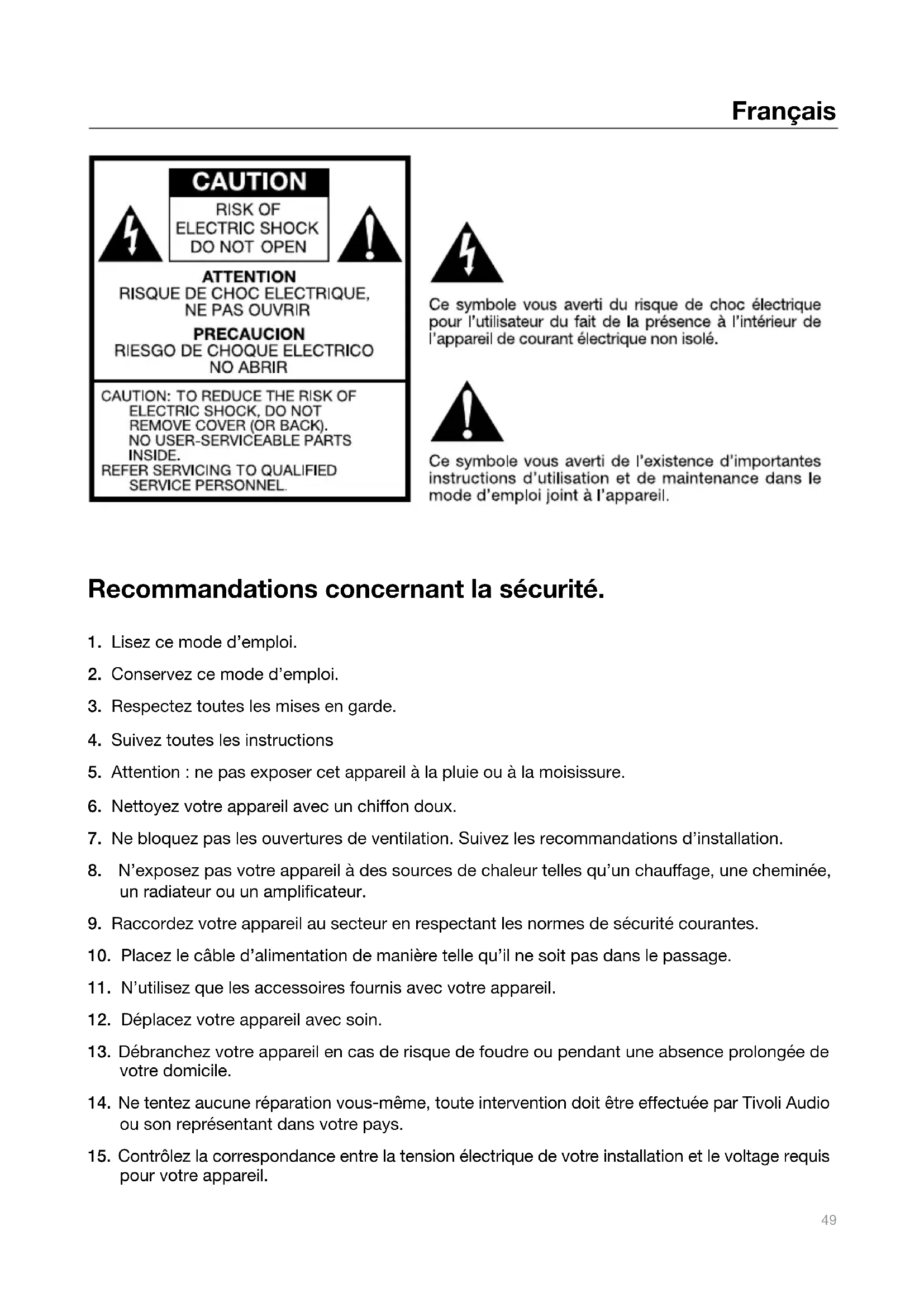 14. Ne tentez aucune réparation vous-même, toute intervention doit être effectuée par Tivoli Audio