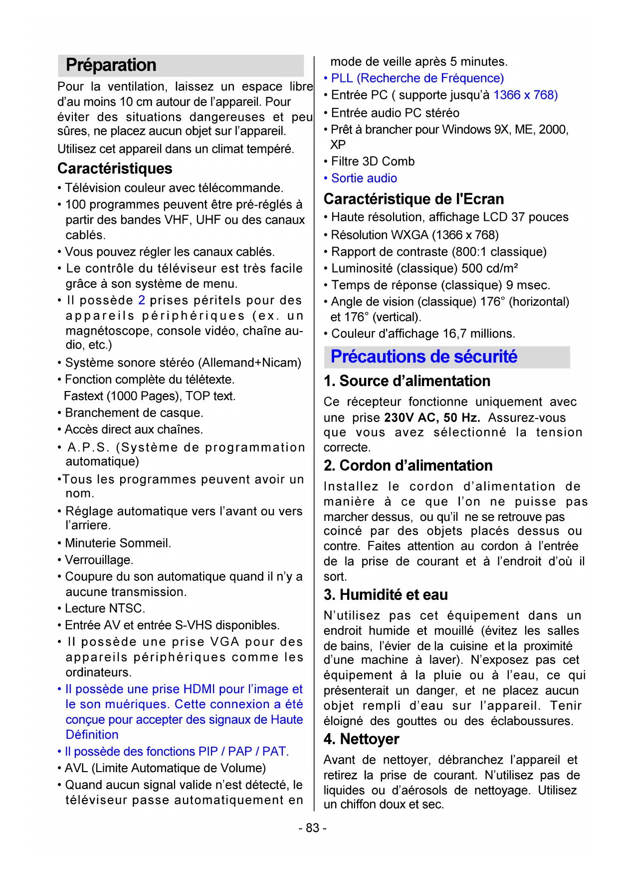 Filtre 3D Comb Sortie audio Caractéristique de l'Ecran Haute résolution, affichage LCD 37 pouces Résolution WXGA (1366 x 768) Rapport de contraste (800:1 classique) Luminosité (classique) 500 cd/m² Temps de réponse (classique) 9 msec. Angle de vision (classique) 176° (horizontal) et 176° (vertical). Couleur d'affichage 16,7 millions. Précautions de sécurité