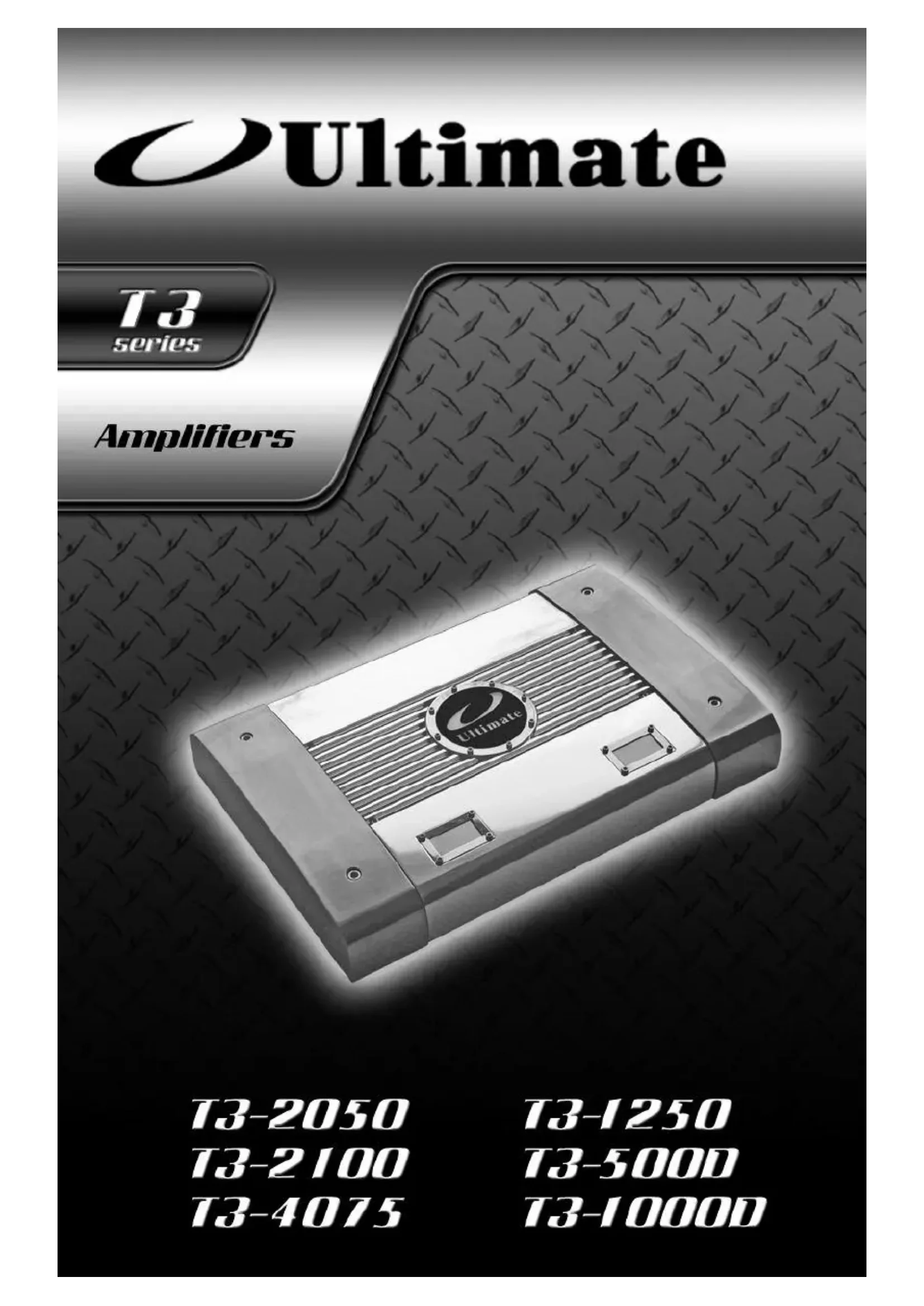 - 4 ohms THD: Signal to Noise Ratio Frequency Response: Speaker Impedance: Damping Factor: Input Sensitivity: Dimensions: Fuse Rating: Max Current: T3-1250 250 x 1 320 x 1 440 x 1 620 x 1 0.06% 90db 5-400 Hz 2 ohms 210 @ 4 ohms 250mV - 8V 11” x 16” x 2 3/8” 28cm x 41cm x 6cm 20A x 2 23A T3-500D 500 x 1 900 x 1 1000 x 1 1800 x 1 0.12% 90db 5-400K hz 2 ohms 230 @ 4 ohms 250mV - 8V 11” x 19 3/4” x 2 3/8” 28cm x 50cm x 6cm 40A x 3 55A Specifications T3-1000D 1000 x 1 1200 x 1 1600 x 1 3500 x 1 0.04% 91db 5-400K hz 2 ohms 220 @ 4 ohms 250mV - 8V 11” x 23” x 2 3/8” 28cm x 58cm x 6cm External Only 136A T3-SeriesD’une allure des plus branchées en ville, les produits Ultimate Car Audio ont été conçus pour offrir un rendement extraordinaire. D’après nos succès passés, nous avons mis au point nos nouveaux produits en leur conférant une toute nouvelle allure et attitude. Après tout, nous voulons que vous possédiez l’ultime système audio dans votre automobile. Ultimate aimerait vous remercier d’avoir acheté ses produits. Introduction Cet appareil est un amplificateur audio de haute puissance. Une utilisation adéquate et prudente de cet appareil vous procurera des années de plaisir et d’agrément. L’exposition à de la musique très forte peut entraîner une perte de l’ouïe temporaire ou permanente. Une mauvaise utilisation ou une installation inadéquate réduira la vie utile de votre appareil et(ou) endommagera le système électrique de votre véhicule. Veuillez vous assurer de lire entièrement ce manuel pour prendre connaissance des marches à suivre sur la manière de monter adéquatement cette unité. Attention Les amplificateurs de série T3 d’Ultimate sont conçus pour livrer une reproduction sonore puissante et dénuée de toute distorsion. Nous soumettons nos amplificateurs à de rigoureux essais de charge afin de vous assurer qu’ils fonctionneront comme un charme dans les conditions les plus lourdes, tendues et exigeantes. Après tout, nous savons que vous le ferez aussi! On peut comparer ces amplificateurs à une voiture hautes performances musclée. Tout comme le bloc moteur poli qui brûle l’asphalte du quart de mille, la conception de ces amplificateurs offre une allure sportive et de hautes performances. La technologie au transistor à effet de champ métal-oxyde semiconducteur(TECMOS – MOSFET), la plaquette de circuits intégrés à double couche et à courant intense, les composants haute pré- cision et les circuits de protection assurent un transfert de puissance sécuritaire et stable à tous nos haut-parleurs. Les affichages numériques individuels vous permettent de surveiller la température et la tension du système. Le filtre subsonique et le filtre passif à réglage variable transportent le peaufinage du système à une dimension jamais encore vue. Possibilité de réglage de volume à distance depuis la plupart des modèles d’amplificateur. La stabilité est essentielle lorsque l’impédance de vos enceintes acoustiques chute sous les niveaux normaux. Nos amplificateurs fonctionnent en toute sécurité avec des charges de 2 Ohm sans causer de distorsion pouvant mettre en péril la maîtrise du système. Le fonctionnement à de telles charges peut produire beaucoup de chaleur. Notre conception à dissipateur thermique assure que nos amplificateurs drainent cet excès de chaleur sans effort tout en laissant à tous vos tubes la chance de pomper fort! Description 10T3-Series