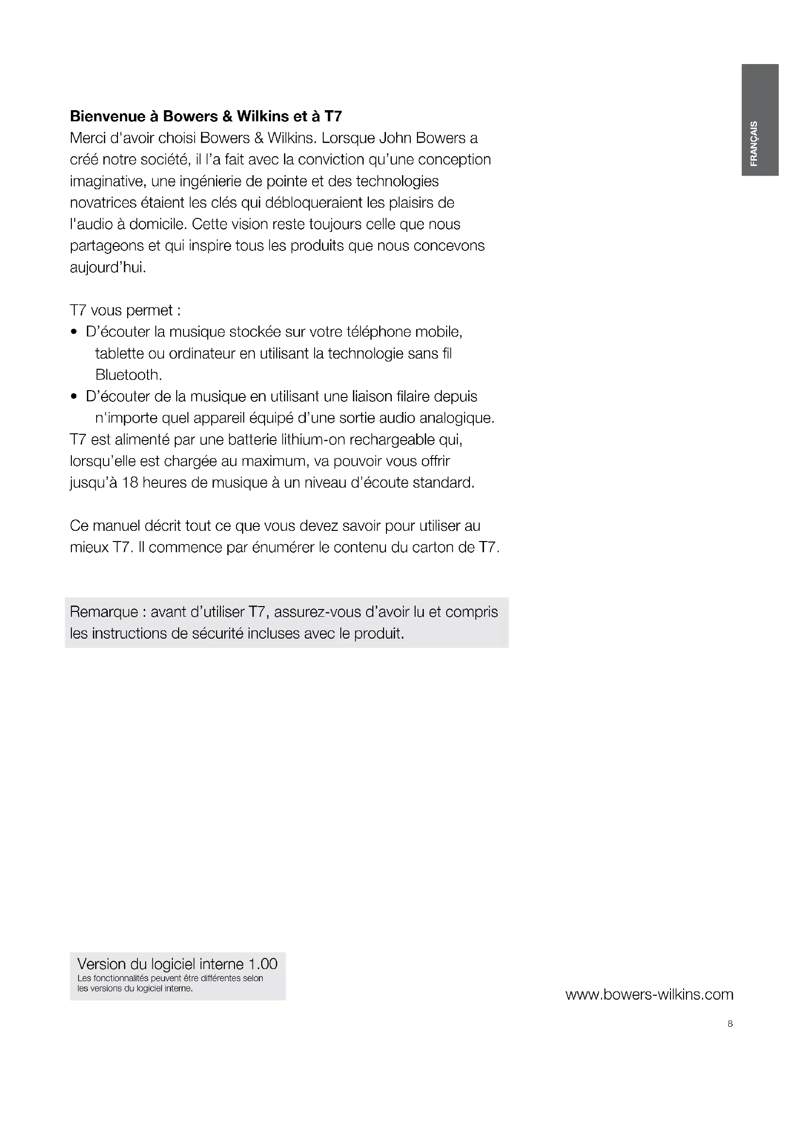 FRANÇAIS www.bowers-wilkins.com Bienvenue à Bowers & Wilkins et à T7 Merci d'avoir choisi Bowers & Wilkins. Lorsque John Bowers a créé notre société, il l’a fait avec la conviction qu’une conception imaginative, une ingénierie de pointe et des technologies novatrices étaient les clés qui débloqueraient les plaisirs de l'audio à domicile. Cette vision reste toujours celle que nous partageons et qui inspire tous les produits que nous concevons aujourd’hui. T7 vous permet :