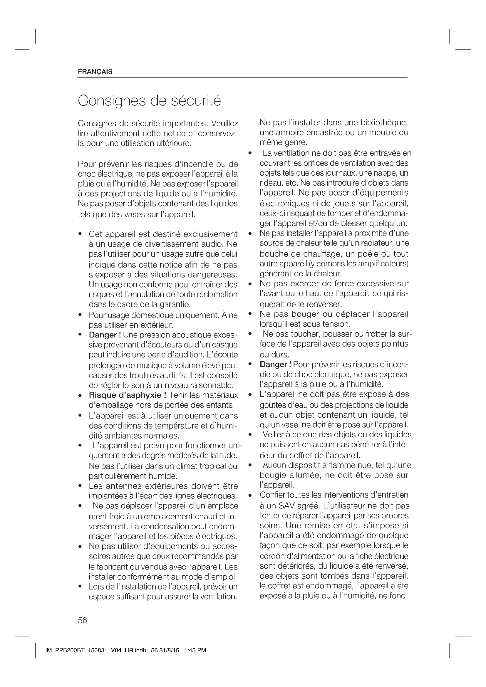 Confier toutes les interventions d’entretien à un SAV agréé. L’utilisateur ne doit pas tenter de réparer l’appareil par ses propres soins. Une remise en état s’impose si l’appareil a été endommagé de quelque façon que ce soit, par exemple lorsque le cordon d’alimentation ou la fiche électrique sont détériorés, du liquide a été renversé, des objets sont tombés dans l’appareil, le coret est endommagé, l’appareil a été exposé à la pluie ou à l’humidité, ne fonc- IM_PPB200BT_150831_V04_HR.indb 56 31/8/15 1:45 PM57 FRANÇAIS tionne pas normalement ou est tombé.