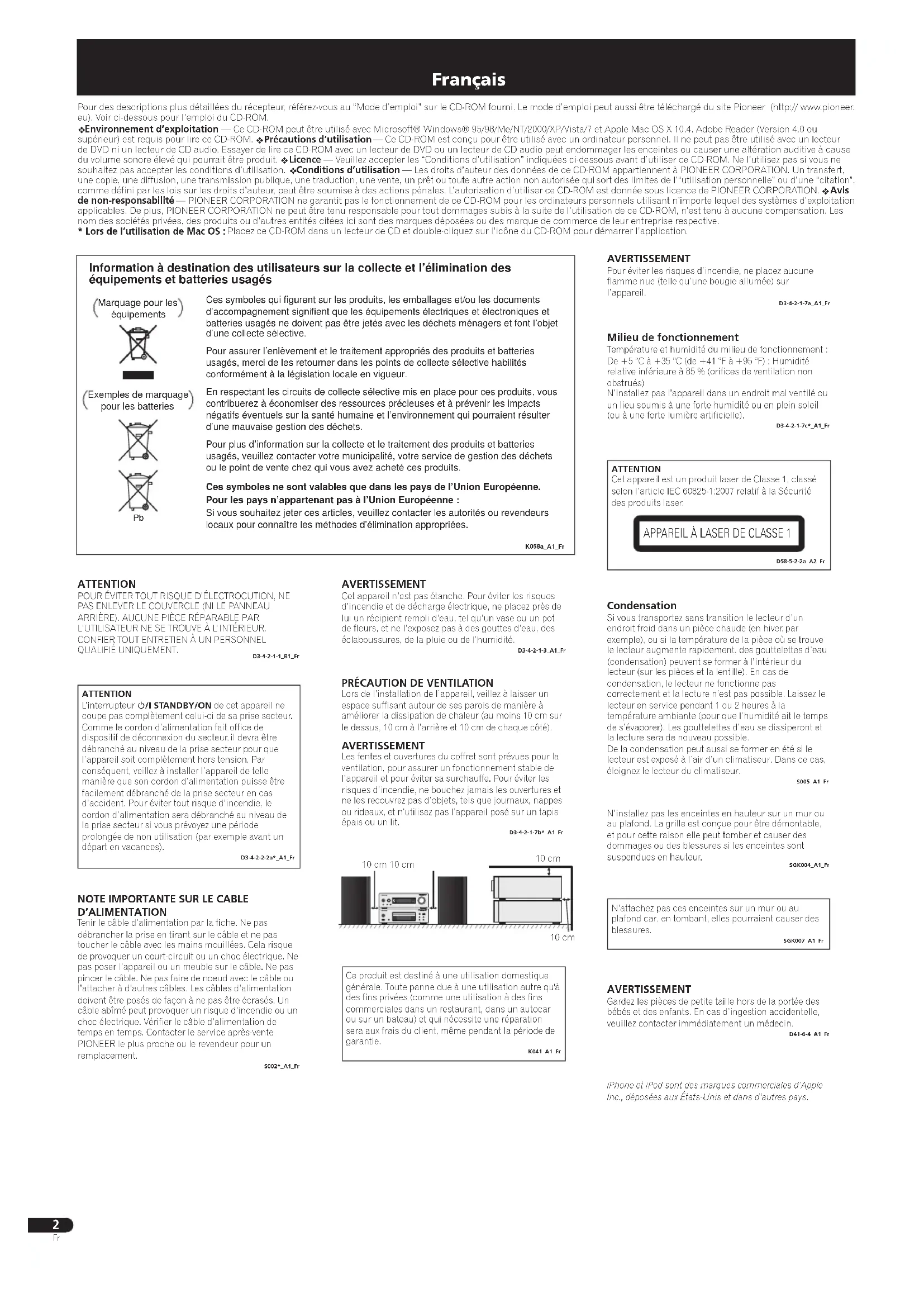 Français Ce produit est destiné à une utilisation domestique générale. Toute panne due à une utilisation autre qu'à des fins privées (comme une utilisation à des fins commerciales dans un restaurant, dans un autocar ou sur un bateau) et qui nécessite une réparation sera aux frais du client, même pendant la période de garantie.K041_A1_Fr AVERTISSEMENT Cet appareil n’est pas étanche. Pour éviter les risques d’incendie et de décharge électrique, ne placez près de lui un récipient rempli d’eau, tel qu’un vase ou un pot de fleurs, et ne l’exposez pas à des gouttes d’eau, des éclaboussures, de la pluie ou de l’humidité.D3-4-2-1-3_A1_Fr AVERTISSEMENT Pour éviter les risques d’incendie, ne placez aucune flamme nue (telle qu’une bougie allumée) sur l’appareil.D3-4-2-1-7a_A1_Fr Milieu de fonctionnement Température et humidité du milieu de fonctionnement :De +5 °C à +35 °C (de +41 °F à +95 °F) ; Humidité relative inférieure à 85 % (orifices de ventilation non obstrués)N’installez pas l’appareil dans un endroit mal ventilé ou un lieu soumis à une forte humidité ou en plein soleil (ou à une forte lumière artificielle). D3-4-2-1-7c*_A1_Fr Pour des descriptions plus détaillées du récepteur, référez-vous au “Mode d’emploi” sur le CD-ROM fourni. Le mode d’emploi peut aussi être téléchargé du site Pioneer (http:// www.pioneer. eu). Voir ci-dessous pour l’emploi du CD-ROM.