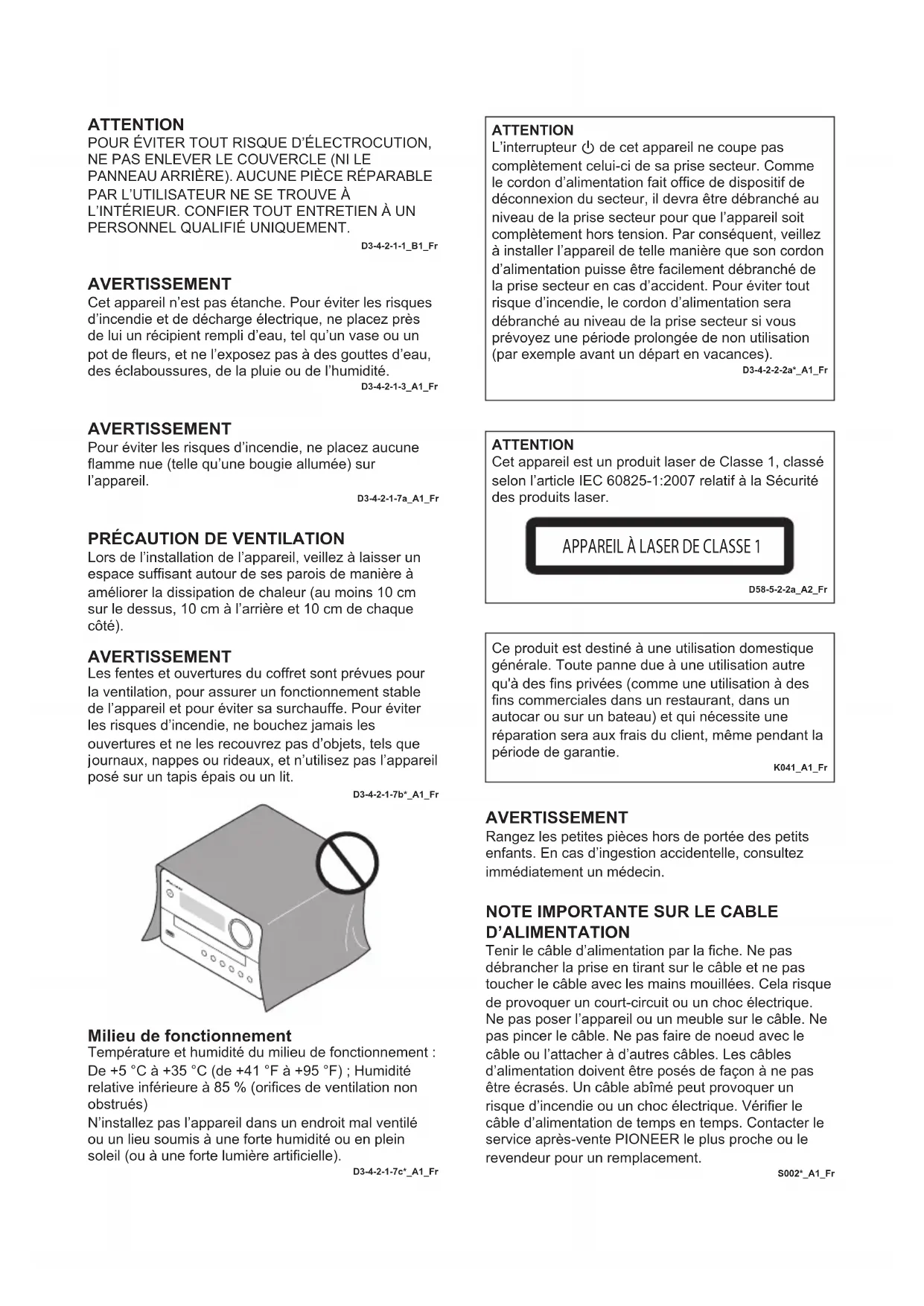 D’ALIMENTATION Tenir le câble d’alimentation par la fiche. Ne pas débrancher la prise en tirant sur le câble et ne pas toucher le câble avec les mains mouillées. Cela risque de provoquer un court-circuit ou un choc électrique. Ne pas poser l’appareil ou un meuble sur le câble. Ne pas pincer le câble. Ne pas faire de noeud avec le câble ou l’attacher à d’autres câbles. Les câbles d’alimentation doivent être posés de façon à ne pas être écrasés. Un câble abîmé peut provoquer un risque d’incendie ou un choc électrique. Vérifier le câble d’alimentation de temps en temps. Contacter le service après-vente PIONEER le plus proche ou le revendeur pour un remplacement. S002*_A1_FrATTENTIONL’interrupteur de cet appareil ne coupe pas complètement celui-ci de sa prise secteur. Comme le cordon d’alimentation fait office de dispositif de déconnexion du secteur, il devra être débranché au niveau de la prise secteur pour que l’appareil soit complètement hors tension. Par conséquent, veillez à installer l’appareil de telle manière que son cordon d’alimentation puisse être facilement débranché de la prise secteur en cas d’accident. Pour éviter tout risque d’incendie, le cordon d’alimentation sera débranché au niveau de la prise secteur si vous prévoyez une période prolongée de non utilisation (par exemple avant un départ en vacances).D3-4-2-2-2a*_A1_Fr AVERTISSEMENT Rangez les petites pièces hors de portée des petits enfants. En cas d’ingestion accidentelle, consultez immédiatement un médecin. SN29402702_X-EM16_26_Fr.book 2 ページ 2016年8月6日 土曜日 午後4時20分K058a_A1_Fr