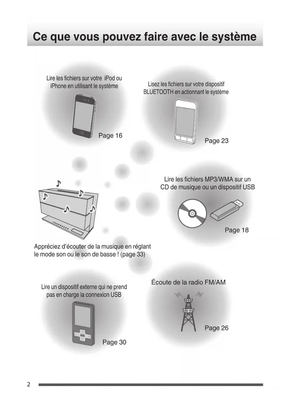 [E]. Écoute de la radio FM/AM Lire les fichiers MP3/WMA sur un CD de musique ou un dispositif USB Lisez les fichiers sur votre dispositif BLUETOOTH en actionnant le système Lire les fichiers sur votre iPod ou iPhone en utilisant le système Lire un dispositif externe qui ne prend pas en charge la connexion USB Appréciez d’écouter de la musique en réglant le mode son ou le son de basse ! (page 33) Page 30 Page 26 Page 18 Page 23 Page 16