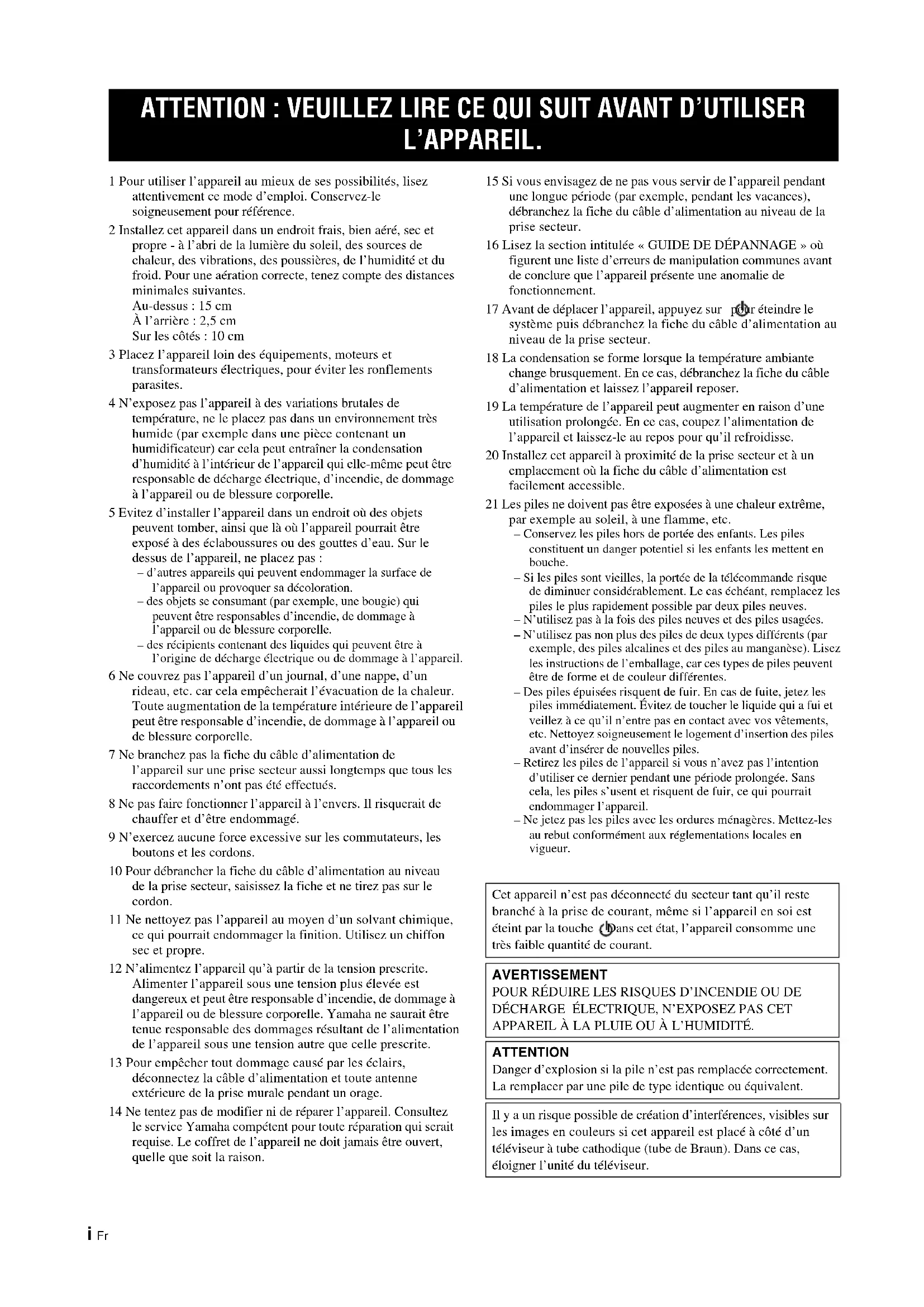 - Yamaha does not guarantee all wireless connections between this unit and devices compatible with Bluetooth function. LASER SAFETY This unit employs a laser. Due to possible eye injury, only a qualified service person should remove the cover or attempt to service this device. DANGER This unit emits visible laser radiation when open. Avoid direct eye exposure to beam. When this unit is plugged into the wall outlet, do not look inside the unit through the disc slot and other openings. ◆ For U.K. customers If the socket outlets in the home are not suitable for the plug supplied with this appliance, it should be cut off and an appropriate 3 pin plug fitted. For details, refer to the instructions described below. Note The plug severed from the mains lead must be destroyed, as a plug with bared flexible cord is hazardous if engaged in a live socket outlet. ◆ Special Instructions for U.K. Model The laser component in this product is capable of emitting radiation exceeding the limit for Class 1. IMPORTANT THE WIRES IN MAINS LEAD ARE COLOURED IN ACCORDANCE WITH THE FOLLOWING CODE: Blue: NEUTRAL Brown: LIVE As the colours of the wires in the mains lead of this apparatus may not correspond with the coloured markings identifying the terminals in your plug, proceed as follows: The wire which is coloured BLUE must be connected to the terminal which is marked with the letter N or coloured BLACK. The wire which is coloured BROWN must be connected to the terminal which is marked with the letter L or coloured RED. Make sure that neither core is connected to the earth terminal of the three pin plug. Information for Users on Collection and Disposal of Old Equipment and Used Batteries These symbols on the products, packaging, and/or accompanying documents mean that used electrical and electronic products and batteries should not be mixed with general household waste. For proper treatment, recovery and recycling of old products and used batteries, please take them to applicable collection points, in accordance with your national legislation and the Directives 2002/96/EC and 2006/66/EC. By disposing of these products and batteries correctly, you will help to save valuable resources and prevent any potential negative effects on human health and the environment which could otherwise arise from inappropriate waste handling. For more information about collection and recycling of old products and batteries, please contact your local municipality, your waste disposal service or the point of sale where you purchased the items. [Information on Disposal in other Countries outside the European Union] These symbols are only valid in the European Union. If you wish to discard these items, please contact your local authorities or dealer and ask for the correct method of disposal. Note for the battery symbol (bottom two symbol examples): This symbol might be used in combination with a chemical symbol. In this case it complies with the requirement set by the Directive for the chemical involved. If there should be color blotching or noise when used near a TV, move this unit away from the TV when using it. Do not use this unit within 22 cm (9 inches) of persons with a heart pacemaker implant or defibrillator implant. Radio waves may affect electro-medical devices. Do not use this unit near medical devices or inside medical facilities. The user shall not reverse engineer, decompile, alter, translate or disassemble the software used in this unit, whether in part or in whole. For corporate users, employees of the corporation itself as well as its business partners shall observe the contractual bans stipulated within this clause. If the stipulations of this clause and this contract cannot be observed, the user shall immediately discontinue using the software. We, Yamaha Music Europe GmbH hereby declare that this unit is in compliance with the essential requirements and other relevant provisions of Directive 1999/5/EC. Yamaha Music Europe GmbH Siemensstr. 22-34 25462 Rellingen, Germany Tel: +49-4101-303-0i Fr 1 Pour utiliser l’appareil au mieux de ses possibilités, lisez attentivement ce mode d’emploi. Conservez-le soigneusement pour référence. 2 Installez cet appareil dans un endroit frais, bien aéré, sec et propre - à l’abri de la lumière du soleil, des sources de chaleur, des vibrations, des poussières, de l’humidité et du froid. Pour une aération correcte, tenez compte des distances minimales suivantes. Au-dessus : 15 cm À l’arrière : 2,5 cm Sur les côtés : 10 cm 3 Placez l’appareil loin des équipements, moteurs et transformateurs électriques, pour éviter les ronflements parasites. 4 N’exposez pas l’appareil à des variations brutales de température, ne le placez pas dans un environnement très humide (par exemple dans une pièce contenant un humidificateur) car cela peut entraîner la condensation d’humidité à l’intérieur de l’appareil qui elle-même peut être responsable de décharge électrique, d’incendie, de dommage à l’appareil ou de blessure corporelle. 5 Evitez d’installer l’appareil dans un endroit où des objets peuvent tomber, ainsi que là où l’appareil pourrait être exposé à des éclaboussures ou des gouttes d’eau. Sur le dessus de l’appareil, ne placez pas : – d’autres appareils qui peuvent endommager la surface de l’appareil ou provoquer sa décoloration. – des objets se consumant (par exemple, une bougie) qui peuvent être responsables d’incendie, de dommage à l’appareil ou de blessure corporelle. – des récipients contenant des liquides qui peuvent être à l’origine de décharge électrique ou de dommage à l’appareil. 6 Ne couvrez pas l’appareil d’un journal, d’une nappe, d’un rideau, etc. car cela empêcherait l’évacuation de la chaleur. Toute augmentation de la température intérieure de l’appareil peut être responsable d’incendie, de dommage à l’appareil ou de blessure corporelle. 7 Ne branchez pas la