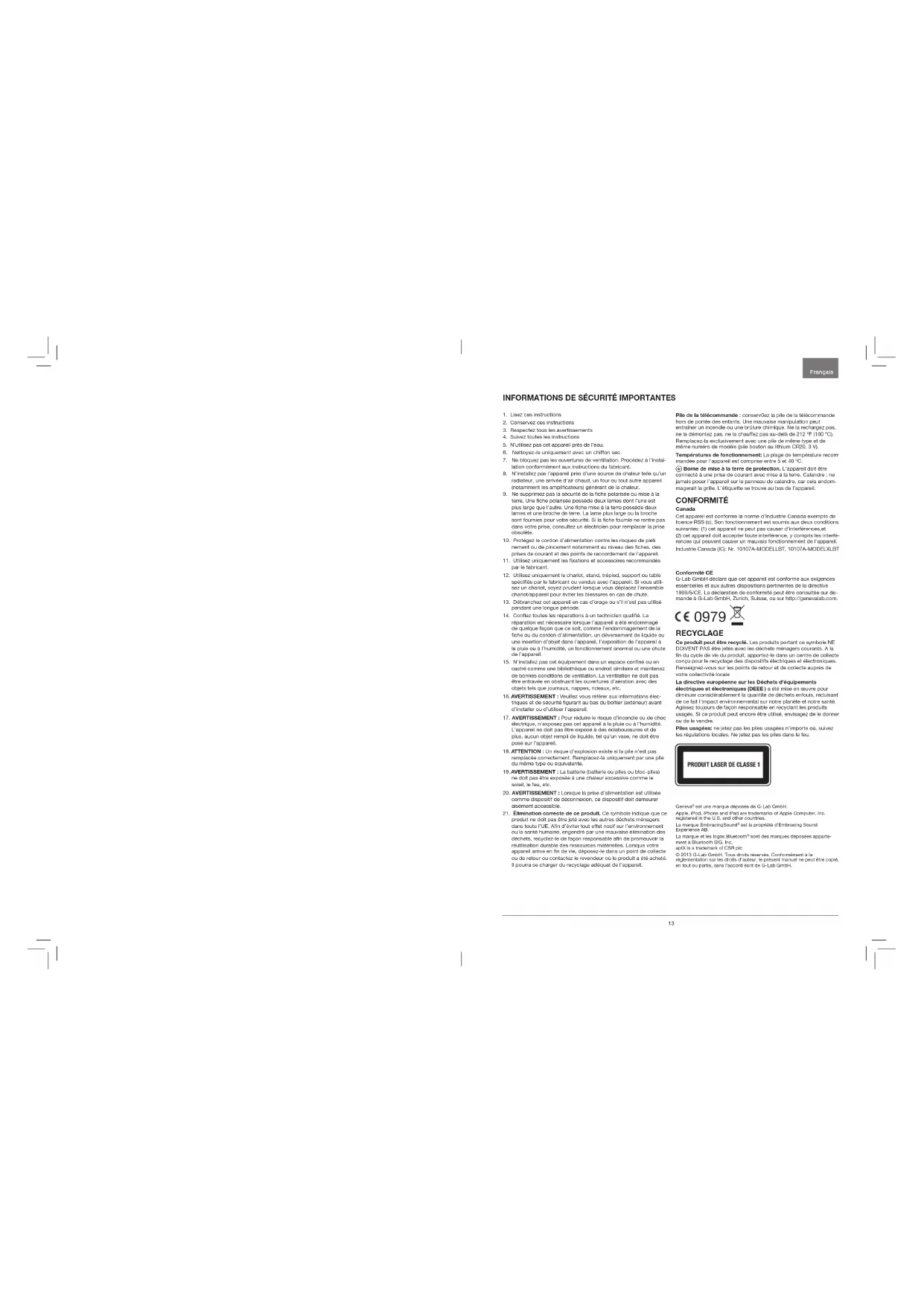 ne doit pas être exposée à une chaleur excessive comme le soleil, le feu, etc.20. AVERTISSEMENT : Lorsque la prise d’alimentation est utilisée comme dispositif de déconnexion, ce dispositif doit demeurer aisément accessible.21. Élimination correcte de ce produit. Ce symbole indique que ce produit ne doit pas être jeté avec les autres déchets ménagers dans toute l’UE. An d’éviter tout effet nocif sur l’environnement ou la santé humaine, engendré par une mauvaise élimination des déchets, recyclez-le de façon responsable an de promouvoir la réutilisation durable des ressources matérielles. Lorsque votre appareil arrive en n de vie, déposez-le dans un point de collecte ou de retour ou contactez le revendeur où le produit a été acheté. Il pourra se charger du recyclage adéquat de l’appareil. Pile de la télécommande : conserv0ez la pile de la télécommande hors de portée des enfants. Une mauvaise manipulation peut entraîner un incendie ou une brûlure chimique. Ne la rechargez pas, ne la démontez pas, ne la chauffez pas au-delà de 212 ºF (100 ºC). Remplacez-la exclusivement avec une pile de même type et de même numéro de modèle (pile bouton au lithium CR20, 3 V).Températures de fonctionnement: La plage de température recom mandée pour l’appareil est comprise entre 5 et 40 ºC. Borne de mise à la terre de protection. L’appareil doit être connecté à une prise de courant avec mise à la terre. Calandre : ne jamais poser l’appareil sur le panneau de calandre, car cela endom-magerait la grille. L’étiquette se trouve au bas de l’appareil. CONFORMITÉ CanadaCet appareil est conforme la norme d’Industrie Canada exempts de licence RSS (s). Son fonctionnement est soumis aux deux conditions suivantes: (1) cet appareil ne peut pas causer d’interférences,et (2) cet appareil doit accepter toute interférence, y compris les interfé-rences qui peuvent causer un mauvais fonctionnement de l’appareil.Industrie Canada (IC): Nr. 10107A-MODELLBT, 10107A-MODELXLBTConformité CEG-Lab GmbH déclare que cet appareil est conforme aux exigences essentielles et aux autres dispositions pertinentes de la directive 1999/5/CE. La déclaration de conformité peut être consultée sur de mande à G-Lab GmbH, Zurich, Suisse, ou sur http://genevalab.com.