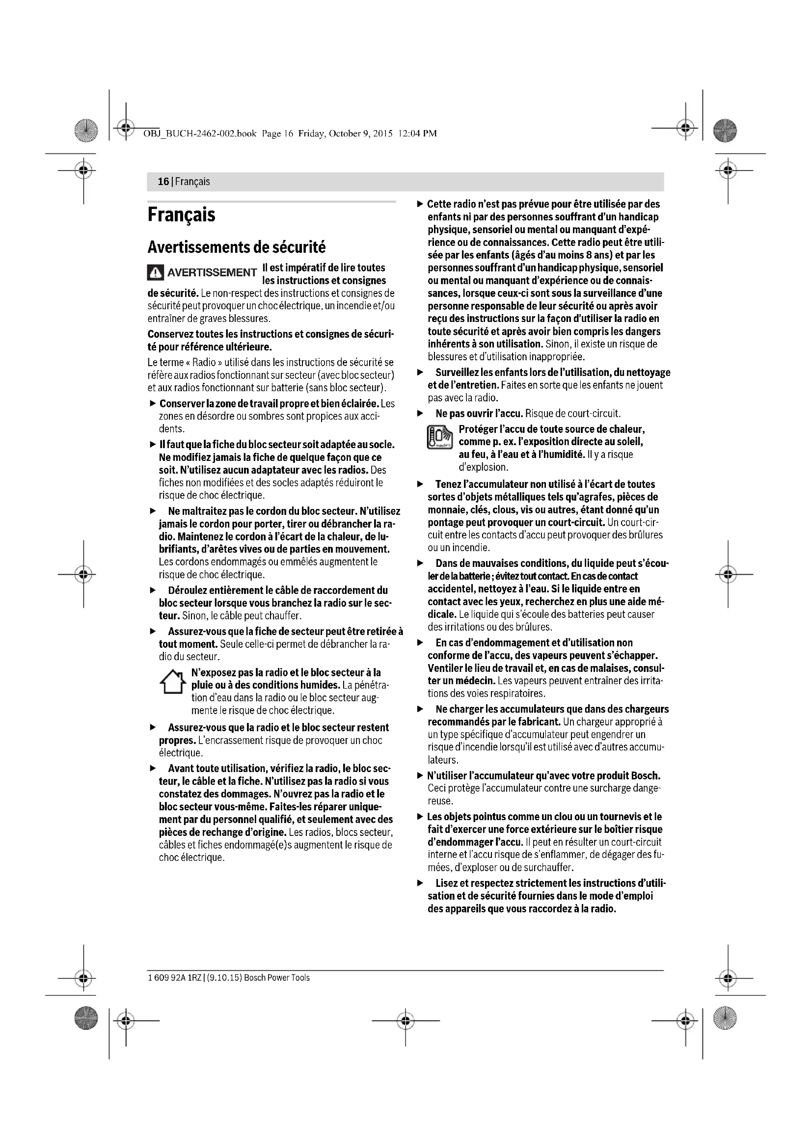 - Performances réduites à des températures <à 0 °CCaractéristiques techniques déterminées avec l’accu fourni avec l’appareil. Bloc d’alimentation N° d’article 1 600 A00 0.. Tension d’entreé V~ 100–240 Fréquence Hz 50/60 Courant d’entrée mA 500 Tension de sortie V= 12 Courant de sortie mA 1500 Poids suivant EPTA-Procedure 01:2014 kg 0,2 Classe de protection /II OBJ_BUCH-2462-002.book Page 17 Friday, October 9, 2015 12:04 PM18 | Français 1 609 92A 1RZ | (9.10.15) Bosch Power Tools Note : L’accumulateur fourni avec l’appareil est en état de charge faible. Afin de garantir la puissance complète de l’ac- cumulateur, chargez-le complètement dans le chargeur avant la première mise en service. N’utilisez que les chargeurs indiqués dans les Caracté- ristiques techniques. Seuls ces chargeurs sont adaptés à la batterie Lithium-Ion utilisée dans votre radio. La batterie Lithium-ion peut être rechargée à tout moment, sans que sa durée de vie n’en soit réduite. Le fait d’inter- rompre le processus de charge n’endommage pas la batterie. Insérez un accu dans le compartiment à accu 17 de façon à ce que les raccords de l’accu soient sur les raccords dans le com- partiment à accu 17 et veillez à ce que l’accu s’encliquète dans le compartiment à accu. L’indicateur de charge de la batterie b s’affiche à l’écran dès qu’une batterie avec une tension suffisante est installée et que la radio n’est pas branchée sur le secteur à l’aide du bloc secteur 24. Le voyant lumineux indiquant l’état de charge de l’accu b in- dique l’état de charge actuel de l’accumulateur. Si le voyant lu- mineux indiquant l’état de charge de l’accu clignote, l’accumu- lateur doit être chargé. Pour retirer l’accumulateur 15, appuyez sur les touches de déverrouillage 16 de l’accumulateur et retirez ce dernier du compartiment à accu 17. Utilisation avec bloc d’alimentation Tenez compte de la tension du réseau ! La tension de la source de courant du bloc d’alimentation doit être conforme aux indications se trouvant sur la plaque signalé- tique du bloc d’alimentation. Ouvrez le capot de protection de la douille de raccordement 12 V 23. Introduisez la fiche 25 du bloc d’alimentation 12 V dans la douille de raccordement 23. Branchez le bloc d’ali- mentation sur le réseau d’alimentation électrique. Utilisez uniquement le bloc secteur Bosch d’origine prévu pour votre radio, ceci afin de garantir un fonction- nement irréprochable de la radio. Pour une protection contre les encrassements, refermez le capot de protection de la douille 12 V 23 quand vous retirez la fiche. Lorsqu’il n’est pas utilisé, le bloc d’alimentation 24 peut être rangé dans le compartiment de stockage de la radio. Action- nez pour cela le levier de verrouillage 21 et ouvrez le cou- vercle 20 du compartiment de stockage. Montage/changement des piles de sauvegarde Pour pouvoir mémoriser l’heure et les stations sur la radio, il est nécessaire d’insérer dans la radio des piles de sauve- garde. Il est recommandé d’utiliser pour cela des piles alca- lines au manganèse. Pour ouvrir le couvercle du compartiment à piles, desserrez la vis 18 et enlevez le couvercle du compartiment à piles 19. In- troduisez les piles de sauvegarde. Veillez à respecter la pola- rité qui doit correspondre à la figure se trouvant à l’extérieur du couvercle du compartiment à piles. Montez à nouveau le couvercle du compartiment à piles 19 et serrez-le à l’aide de la vis 18. Remplacez les piles lorsque l’affichage e faiblit et que l’heure n’est plus mémorisée. Remplacez toujours toutes les piles en même temps. N’utili- sez que des piles de la même marque avec la même capacité. Retirez les piles de la radio avant une longue période sans utilisation de l’appareil. En cas de stockage prolon- gé, les piles risquent de se corroder et de se décharger. Fonctionnement Protégez la radio de l’humidité et du rayonnement so- laire direct. La radio est uniquement adaptée pour une uti- lisation dans les espaces intérieurs secs. Mode audio Mise en Marche/Arrêt Pour mettre en marche la radio, actionnez la touche Marche / Arrêt 3. L’affichage 8 s’active et la dernière source audio réglée au moment de l’arrêt de la radio est reprise. Note : Lors de la première utilisation avec accu ou après une longue durée de non-utilisation de la radio, il peut s’avérer né- cessaire d’actionner la touche Marche/Arrêt 3 plusieurs fois ou de façon prolongée pour allumer la radio. A chaque fois qu’une touche est appuyée, l’écran 8 est illumi- né pendant quelques secondes. Pour arrêter la radio, actionnez à nouveau la touche Marche / Arrêt 3. Le réglage actuel de la source audio est mémorisé. Pour économiser l’énergie, ne mettez en marche la radio qu’au moment de son utilisation. Réglage du volume Après la mise en marche de la radio, un volume moyen (valeur 10) est toujours réglé. Pour augmenter le volume, appuyez sur la touche «Vol+» 6, et pour réduire le volume, sur la touche «Vol–» 5. Le réglage du volume «VL» apparaît avec une valeur entre 0 et 20 pen- dant quelques secondes dans l’affichage e de l’écran. Avant de sélectionner ou de changer une station, réglez le vo- lume sur une valeur basse ; avant d’activer une source audio externe, réglez le volume sur une valeur moyenne. Pour arrêter le son, appuyez sur la touche «Mute» 13. Pour remettre en marche le son, appuyez soit à nouveau sur la touche «Mute» 13 ou sur une des touches de volume «Vol+» 6 ou «Vol–» 5. Affichage Capacité ≥2/3 ≥1/3 <1/3 Réserve Accumulateur vide OBJ_BUCH-2462-002.book Page 18 Friday, October 9, 2015 12:04 PMFrançais | 19 Bosch Power Tools 1 609 92A 1RZ | (9.10.15) Réglage du son Pour une restitution optimale du son, un égaliseur est intégré dans la radio. Appuyez une fois sur la touche « Equ