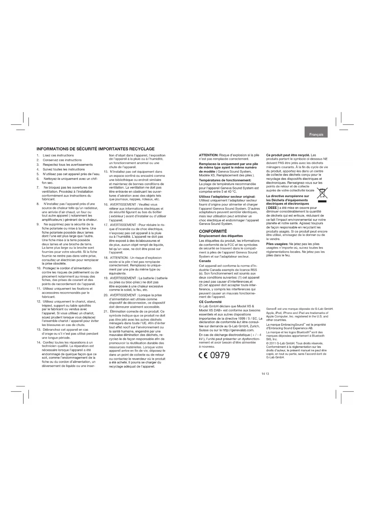 a été mise en oeuvre pour diminuer considérablement la quantité de déchets qui est enfouie, réduisant de ce fait l’impact environnemental sur notre planète et notre santé. Agissez toujours de façon responsable en recyclant les produits usagés. Si ce produit peut encore être utilisé, envisagez de le donner ou de le vendre. Ne jetez pas les piles usagées n’importe où, suivez toutes les réglementations locales. Ne jetez pas les piles dans le feu. Geneva est une marque déposée de G-Lab GmbH.Apple, iPod, iPhone and iPad are trademarks of Apple Computer, Inc. registered in the U.S. and other countries.La marque EmbracingSound est la propriété d’Embracing Sound Experience AB.La marque et les logos Bluetooth sont des marques déposées appartement à Bluetooth SIG, Inc. © 2011 G-Lab GmbH. Tous droits réservés. Conformément à la réglementation sur les droits d’auteur, le présent manuel ne peut être copié, en tout ou partie, sans l’accord écrit de G-Lab GmbH. 1. Lisez ces instructions 2. Conservez ces instructions 3. Respectez tous les avertissements 4. Suivez toutes les instructions 5. N’utilisez pas cet appareil près de l’eau. 6. Nettoyez-le uniquement avec un chif- fon sec. 7. Ne bloquez pas les ouvertures de ventillation. Procédez à l’installation conformément aux instructions du fabricant. 8. N’installez pas l’appareil près d’une source de chaleur telle qu’un radiateur, une arrivée d’air chaud, un four ou tout autre appareil ( notamment les amplicateurs ) générant de la chaleur. 9. Ne supprimez pas la sécurité de la che polarisée ou mise à la terre. Une che polarisée possède deux lames dont l’une est plus large que l’autre. Une che mise à la terre possède deux lames et une broche de terre. La lame plus large ou la broche sont fournies pour votre sécurité. Si la che fournie ne rentre pas dans votre prise, consultez un électricien pour remplacer la prise obsolète. 10. Protégez le cordon d’alimentation contre les risques de piétinement ou de pincement notamment au niveau des ches, des prises de courant et des points de raccordement de l’appareil. 11. Utilisez uniquement les xations et accessoires recommandés par le fabricant. 12. Utilisez uniquement le chariot, stand, trépied, support ou table spéciés par le fabricant ou vendus avec l’appareil. Si vous utilisez un chariot, soyez prudent lorsque vous déplacez l’ensemble chariot / appareil pour éviter les blessures en cas de chute. 13. Débranchez cet appareil en cas d’orage ou s’il n’est pas utilisé pendant une longue période. 14. Conez toutes les réparations à un technicien qualié. La réparation est nécessaire lorsque l’appareil a été endommagé de quelque façon que ce soit, comme l’endommagement de la che ou du cordon d’alimentation, un déversement de liquide ou une inser- tion d’objet dans l’appareil, l’exposition de l’appareil à la pluie ou à l’humidité, un fonctionnement anormal ou une chute de l’appareil. 15. N’installez pas cet équipement dans un espace conné ou encastré comme une bibliothèque ou endroit similaire et maintenez de bonnes conditions de ventilation. La ventilation ne doit pas être entravée en obstruant les ouver- tures d’aération avec des objets tels que journaux, nappes, rideaux, etc. 16. AVERTISSEMENT : Veuillez vous référer aux informations électriques et de sécurité gurant au bas du boîtier ( extérieur ) avant d’installer ou d’utiliser l’appareil. 17. AVERTISSEMENT : Pour réduire le ris- que d’incendie ou de choc électrique, n’exposez pas cet appareil à la pluie ou à l’humidité. L’appareil ne doit pas être exposé à des éclaboussures et de plus, aucun objet rempli de liquide, tel qu’un vase, ne doit être posé sur l’appareil. 18. ATTENTION : Un risque d’explosion existe si la pile n’est pas remplacée correctement. Remplacez-la unique- ment par une pile du même type ou équivalente. 19. AVERTISSEMENT : La batterie ( batterie ou piles ou bloc-piles ) ne doit pas être exposée à une chaleur excessive comme le soleil, le feu, etc. 20. AVERTISSEMENT : Lorsque la prise d’alimentation est utilisée comme dispositif de déconnexion, ce dispositif doit demeurer aisément accessible. 21. Élimination correcte de ce produit. Ce symbole indique que ce produit ne doit pas être jeté avec les autres déchets ménagers dans toute l’UE. An d’éviter tout effet nocif sur l’environnement ou la santé humaine, engendré par une mauvaise élimination des déchets, re- cyclez-le de façon responsable an de promouvoir la réutilisation durable des ressources matérielles. Lorsque votre appareil arrive en n de vie, déposez-le dans un point de collecte ou de retour ou contactez le revendeur où le produit a été acheté. Il pourra se charger du recyclage adéquat de l’appareil. 16 15 Français