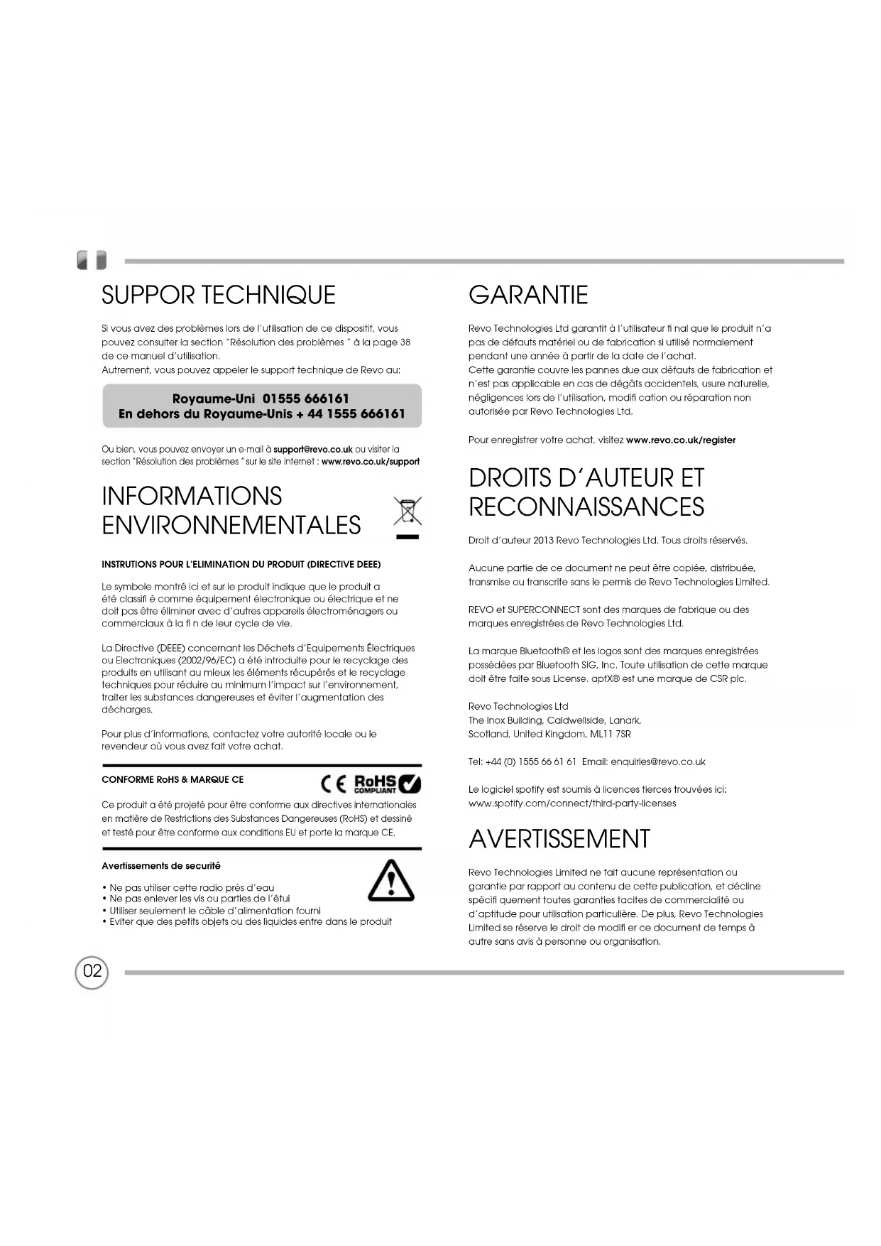 RECONNAISSANCES Droit d’auteur 2013 Revo Technologies Ltd. Tous droits réservés. Aucune partie de ce document ne peut être copiée, distribuée, transmise ou transcrite sans le permis de Revo Technologies Limited. REVO et SUPERCONNECT sont des marques de fabrique ou des marques enregistrées de Revo Technologies Ltd. La marque Bluetooth® et les logos sont des marques enregistrées possédées par Bluetooth SIG, Inc. Toute utilisation de cette marque doit être faite sous License. aptX® est une marque de CSR plc. Revo Technologies Ltd The Inox Building, Caldwellside, Lanark, Scotland, United Kingdom, ML11 7SR Tel: +44 (0) 1555 66 61 61 Email: enquiries@revo.co.uk Le logiciel spotify est soumis à licences tierces trouvées ici: www.spotify.com/connect/third-party-licenses AVERTISSEMENT Revo Technologies Limited ne fait aucune représentation ou garantie par rapport au contenu de cette publication, et décline spécifi quement toutes garanties tacites de commercialité ou d’aptitude pour utilisation particulière. De plus, Revo Technologies Limited se réserve le droit de modifi er ce document de temps à autre sans avis à personne ou organisation.CONTENUS 02 Support technique 02 Informations environnementales 02 Garantie 02 Droits d’auteur et reconnaissances 02 Avertissement 03 Bienvenue / Déballage 04 Anatomie 05 Télécommande 06 Câble d’alimentation 06 Installation 07 Structure de Contrôle et Menu