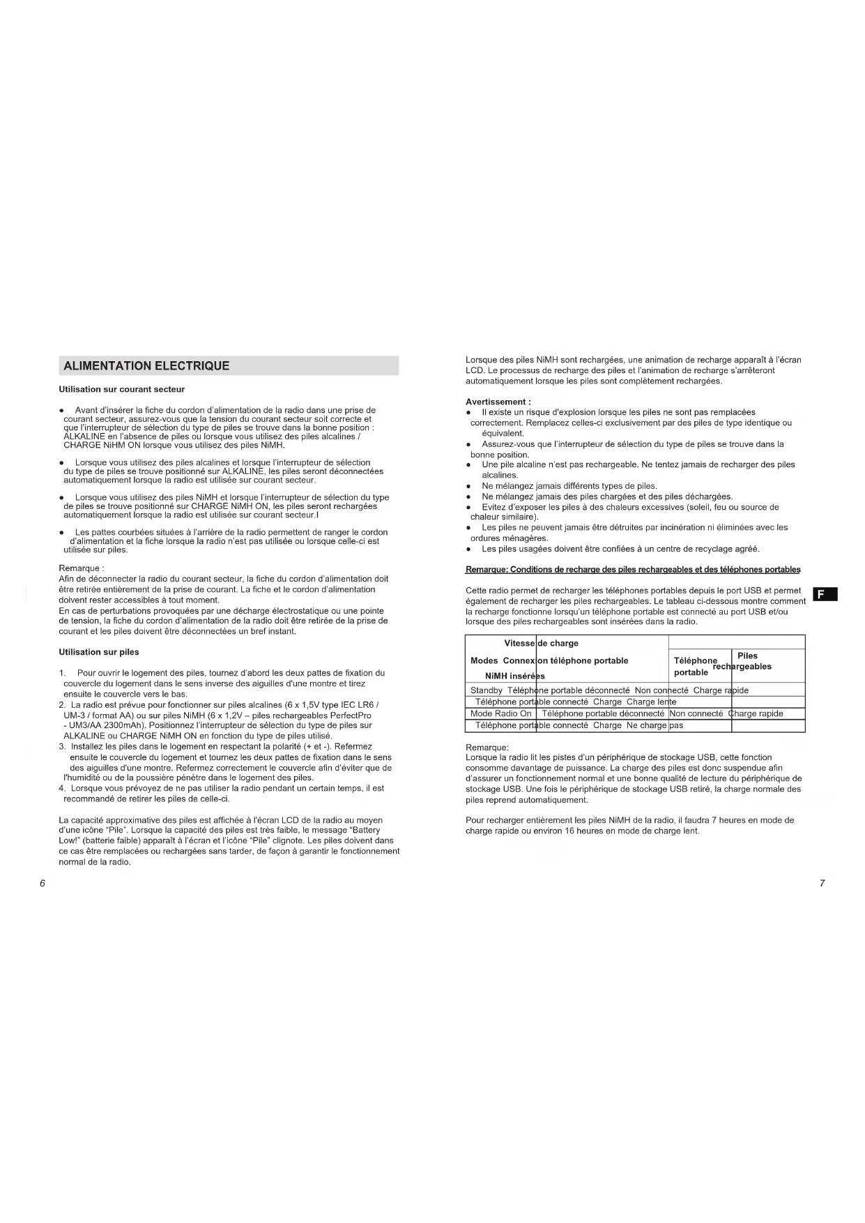 ● Ilexisteunrisqued'explosionlorsquelespilesnesontpasremplaces correctement. Remplacez celles-ci exclusivement par des piles de type identique ou équivalent. ● Assurez-vousquel’interrupteurdeslectiondutypedepilessetrouvedansla bonne position. ● Unepilealcalinen’estpasrechargeable.Netentezjamaisderechargerdespiles alcalines. ● Nemlangezjamaisdiffrentstypesdepiles. ● Nemlangezjamaisdespileschargesetdespilesdcharges. ● Evitezd’exposerlespilesdeschaleursexcessives(soleil,feuousourcede chaleur similaire). ● Lespilesnepeuventjamaistredtruitesparincinrationniliminesavecles ordures ménagères. ● Lespilesusagesdoiventtreconesuncentrederecyclageagr. Remarque: Conditions de recharge des piles rechargeables et des téléphones portables Cette radio permet de recharger les téléphones portables depuis le port USB et permet également de recharger les piles rechargeables. Le tableau ci-dessous montre comment la recharge fonctionne lorsqu’un téléphone portable est connecté au port USB et/ou lorsque des piles rechargeables sont insérées dans la radio. Vitesse de charge Modes Connexion téléphone portable Téléphone Piles portable rechargeables NiMH insérées Standby Téléphone portable déconnecté Non connecté Charge rapide Téléphone portable connecté Charge Charge lente Mode Radio On Téléphone portable déconnecté Non connecté Charge rapide Téléphone portable connecté Charge Ne charge pas Remarque: Lorsque la radio lit les pistes d’un périphérique de stockage USB, cette fonction consommedavantagedepuissance.Lachargedespilesestdoncsuspenduean d’assurer un fonctionnement normal et une bonne qualité de lecture du périphérique de stockage USB. Une fois le périphérique de stockage USB retiré, la charge normale des piles reprend automatiquement. Pour recharger entièrement les piles NiMH de la radio, il faudra 7 heures en mode de charge rapide ou environ 16 heures en mode de charge lent. F98