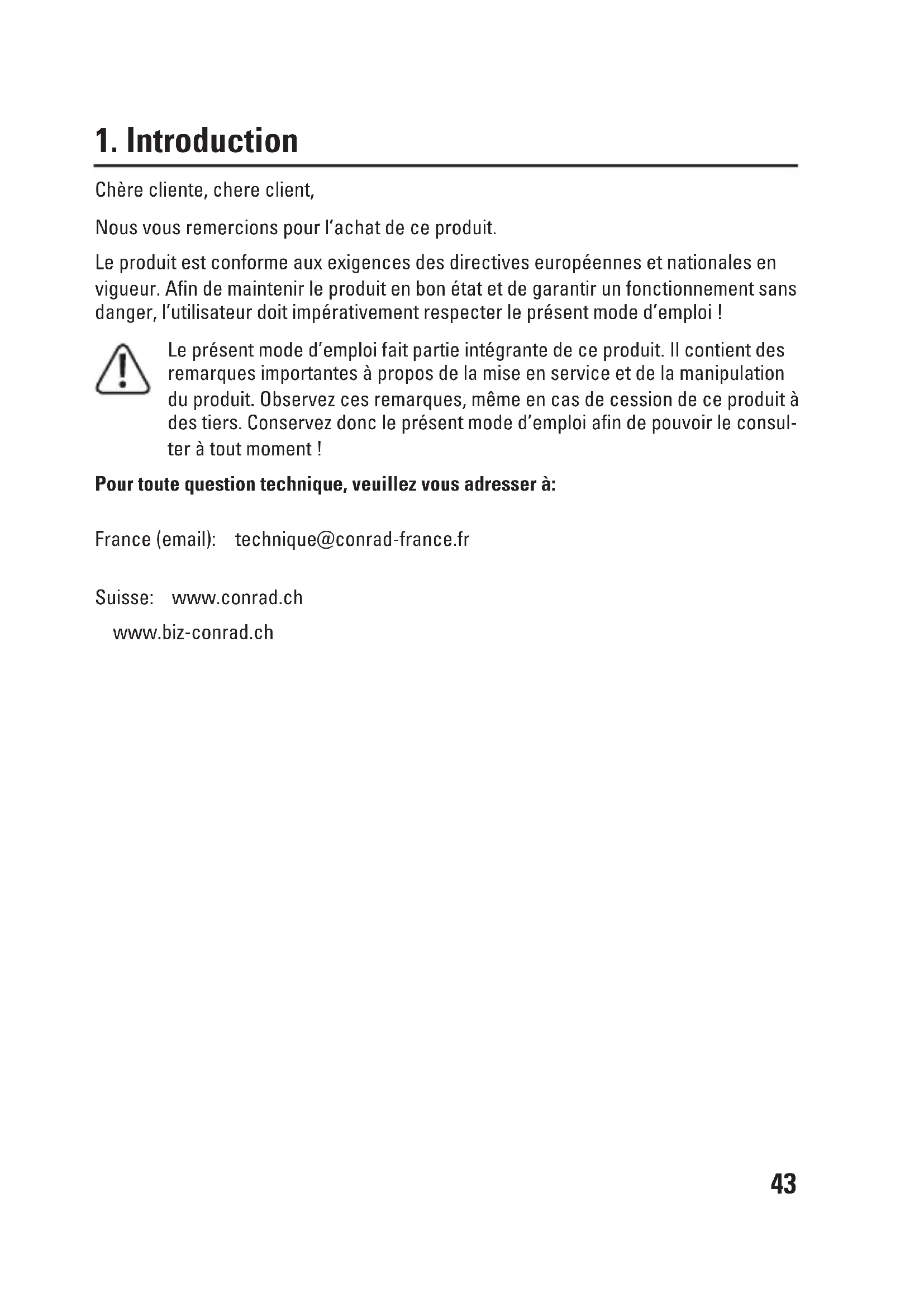 Chère cliente, chere client, Nous vous remercions pour l’achat de ce produit. Leproduitestconformeauxexigencesdesdirectiveseuropéennesetnationalesen vigueur. Afin de maintenir le produit en bon état et de garantir un fonctionnement sans danger, l’utilisateur doit impérativement respecter le présent mode d’emploi ! Le présent mode d’emploi fait partie intégrante de ce produit. Il contient des remarquesimportantesàproposdelamiseenserviceetdelamanipulation duproduit.Observezcesremarques,mêmeencasdecessiondeceproduità des tiers. Conservez donc le présent mode d’emploi afin de pouvoir le consul- teràtoutmoment! Pour toute question technique, veuillez vous adresser à: France(email): technique@conrad-france.fr Suisse: www.conrad.ch www.biz-conrad.ch4444