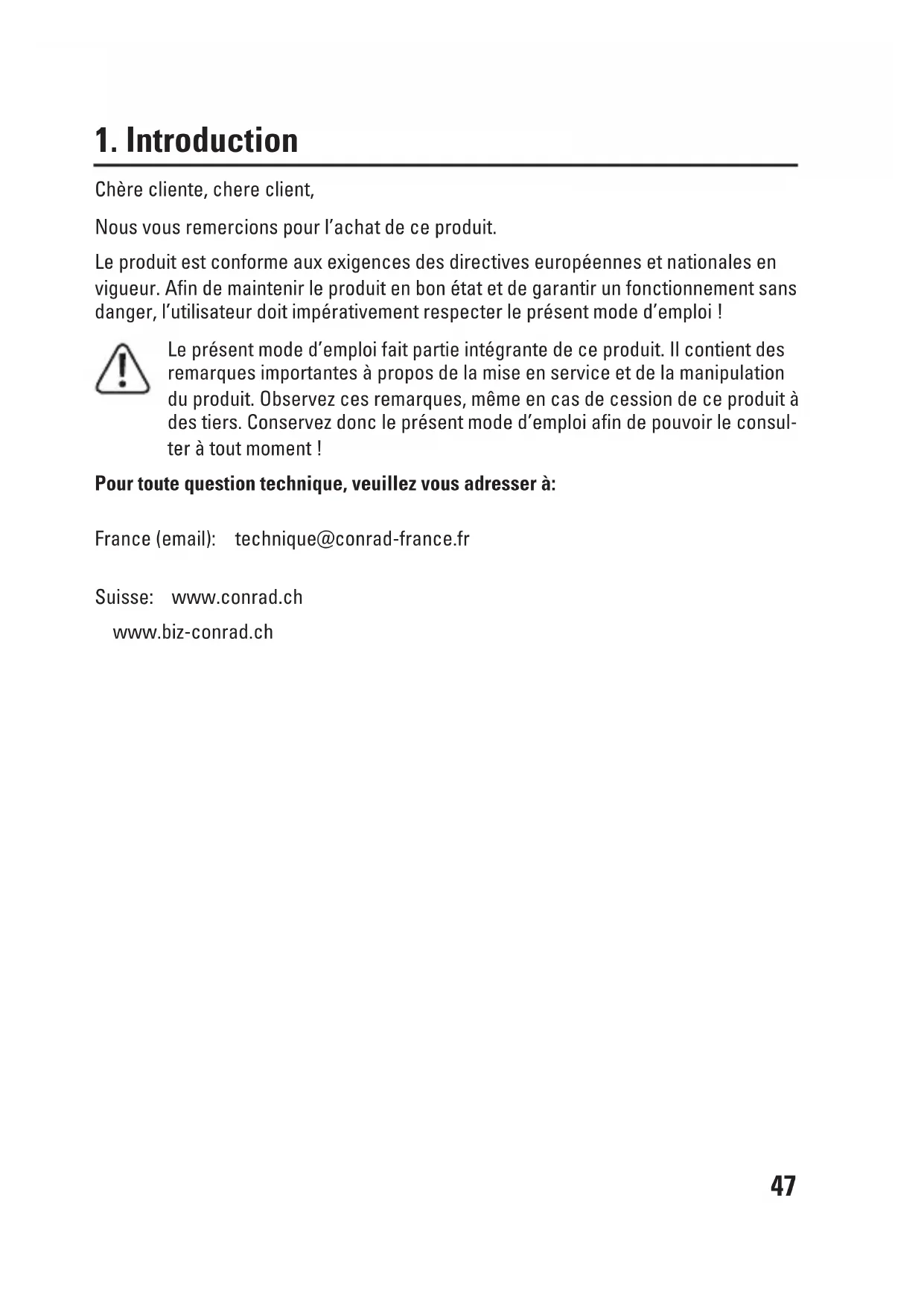 Chère cliente, chere client, Nous vous remercions pour l’achat de ce produit. Leproduitestconformeauxexigencesdesdirectiveseuropéennesetnationalesen vigueur. Afin de maintenir le produit en bon état et de garantir un fonctionnement sans danger, l’utilisateur doit impérativement respecter le présent mode d’emploi ! Le présent mode d’emploi fait partie intégrante de ce produit. Il contient des remarquesimportantesàproposdelamiseenserviceetdelamanipulation duproduit.Observezcesremarques,mêmeencasdecessiondeceproduità des tiers. Conservez donc le présent mode d’emploi afin de pouvoir le consul- teràtoutmoment! Pour toute question technique, veuillez vous adresser à: France(email): technique@conrad-france.fr Suisse: www.conrad.ch www.biz-conrad.ch4848