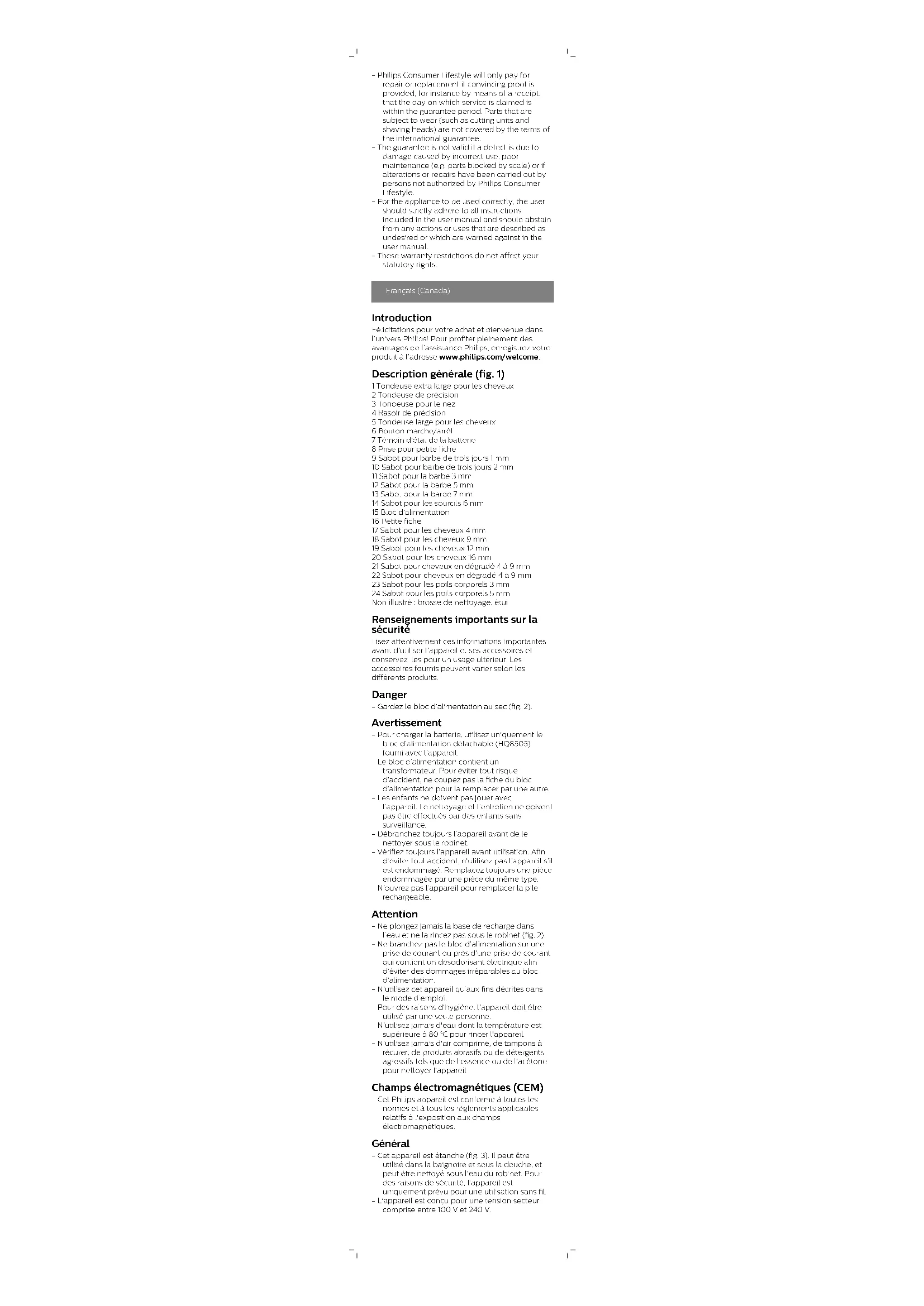Sabots pour cheveux en dégradé 4 à 9 mm 1 Fixez le sabot sur la tondeuse extra large pour cheveux afin de couper les cheveux autour d’une oreille. Puis, fixez l’autre sabot sur la tondeuse pour les cheveux afin de couper les cheveux autour de l’autre oreille.2 Placez l’appareil en dessous ou au-dessus de l’oreille selon le sens de coupe que vous préférez. Assurez-vous de toujours tenir l’appareil de sorte que le côté du sabot où les dents sont les plus courtes soit proche de votre oreille. 3 Déplacez lentement la tondeuse autour de l’oreille en tenant fermement l’appareil (fig. 19). Pour obtenir de meilleurs résultats, déplacez la tondeuse dans le sens inverse de la pousse des poils (d’arrière en avant). Accessoires de précision pour le visage Tondeuse de précision Utilisez la tondeuse de précision pour créer de fines lignes et dessiner les contours, et ainsi parfaire le style de votre visage, au plus près de la peau (longueur de coupe de 0,5 mm). 1 Tenez la tête de coupe de précision perpendiculairement à la peau et déplacez-la de haut en bas en appliquant une légère pression (fig. 20). Sabot pour les sourcils Utilisez la tondeuse large pour cheveux avec le sabot pour les sourcils afin d’éclaircir vos sourcils ou de tailler vos favoris à une longueur de 6 mm. 1 Déplacez lentement la tondeuse dans le sens de la pousse des cheveux. Appuyez légèrement pour vous assurer que la surface du sabot reste toujours en contact avec la peau (fig. 21). Tondeuse pour le nez Utilisez la tondeuse pour le nez afin de couper les poils de votre nez et de vos oreilles. - Assurez-vous que vos narines sont propres. Assurez-vous que vos oreilles sont propres et exemptes de cire. - N’introduisez pas le bout de l’accessoire de plus de 5 mm. - Nettoyez l’accessoire après chaque utilisation. Coupe des poils du nez 1 Effectuez des mouvements lents vers l’intérieur et l’extérieur du nez en faisant pivoter l’accessoire pour couper les poils superflus (fig. 22). Coupe des poils des oreilles 1 Déplacez lentement l’accessoire autour de l’oreille pour couper les poils superflus autour du pavillon de l’oreille. 2 Effectuez des mouvements lents vers l’intérieur et l’extérieur de l’oreille pour couper les poils superflus (fig. 22). Rasoir de précision Vous pouvez utiliser le rasoir de précision après la coupe pour raser avec précision les poils superflus sur vos joues, votre menton et le long de votre barbe. Commencez par effectuer une précoupe de votre barbe avec la tondeuse large pour cheveux sans sabot afin d’obtenir le meilleur résultat. Remarque : Utilisez le rasoir de précision pour supprimer les poils restants et affiner le style de votre barbe. Il n’est pas conçu pour un rasage complet. 1 Appuyez doucement le rasoir de précision sur la peau et suivez les contours pour retirer tout poil (fig. 23) superflu. Nettoyage N’utilisez jamais de tampons à récurer, de nettoyants abrasifs ni de produits puissants tels que l’essence ou l’acétone pour nettoyer le produit. Ne séchez jamais les dents de tonte à l’aide d’une serviette ou d’un mouchoir, car vous risqueriez de les endommager. Après chaque utilisation : lavage sous le robinet. 1 Éteignez l’appareil et débranchez-le de la prise de courant. 2 Retirez le sabot ou tout autre accessoire de coupe de l’appareil. 3 Rincez le compartiment à poils sous un robinet d’eau chaude. 4 Nettoyez l’accessoire de coupe et le sabot sous un robinet d’eau chaude. 5 Retirez l’excès d’eau en secouant délicatement les pièces, puis laissez sécher complètement à l’air toutes les pièces. Nettoyage en profondeur 1 Éteignez l’appareil et débranchez-le de la prise de courant. 2 Essuyez le manche de l’appareil à l’aide d’un chiffon sec. 3 Retirez le sabot ou tout autre accessoire de coupe de l’appareil. 4 Enlevez les poils accumulés dans le compartiment à poils à l’aide de la brosse de nettoyage fournie. 5 Enlevez les poils accumulés dans l’accessoire de coupe ou dans le sabot à l’aide de la brosse de nettoyage fournie. 6 Nettoyez l’accessoire de coupe sous un robinet d’eau chaude. 7 Nettoyez le sabot sous un robinet d’eau chaude. 8 Retirez l’excès d’eau en secouant délicatement les pièces, puis laissez sécher complètement à l’air toutes les pièces. Nettoyage de la tondeuse pour le nez Nettoyez la tondeuse pour le nez immédiatement après utilisation et lorsqu’une quantité importante de poils ou de poussière s’est accumulée dans la tête de la tondeuse. 1 Rincez la tondeuse pour le nez avec de l’eau chaude (fig. 24). 2 Mettez l’appareil en marche et rincez une fois de plus la tête de la tondeuse pour le nez afin d’éliminer les poils restants. Éteignez de nouveau l’appareil. Pour un nettoyage complet, plongez la tête de la tondeuse pour le nez dans un bol d’eau tiède pendant quelques minutes, puis mettez l’appareilen marche afin d’en retirer les poils et les poussières accumulés. 3 Retirez l’excès d’eau en secouant délicatement les pièces, puis laissez sécher complètement à l’air toutes les pièces. Nettoyage du rasoir de précision 1 Tenez le rasoir de précision par les rainures situées de chaque côté et séparez la partie supérieure de la partie inférieure (fig. 25). 2 Enlevez les poils accumulés dans le rasoir de précision en le secouant ou en soufflant dessus (fig. 26). 3 Nettoyez la partie supérieure du rasoir de précision sous un robinet (fig. 27) d’eau chaude. 4 Retirez l’excès d’eau en secouant délicatement les pièces, puis laissez sécher complètement à l’air toutes les pièces. 5 Replacez la partie supérieure du rasoir de précision sur la partie inférieure. Rangement - Ranger l'appareil dans l’étui fourni. Remarque : Assurez-vous que l'appareil est sec avant de le ranger dans l'étui. Commande d'accessoires Pour acheter des accessoires ou des pièce