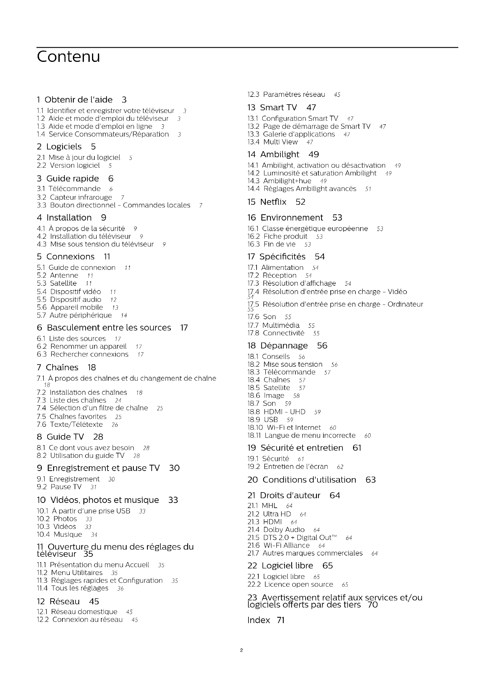 Avertissement relatif aux services et/ou logiciels offerts par des tiers Les services et/ou logiciels offerts par des tiers peuvent être modifiés, suspendus ou supprimés sans préavis. TP Vision ne peut pas être tenu pour responsable dans ce type de situation. 7071Index