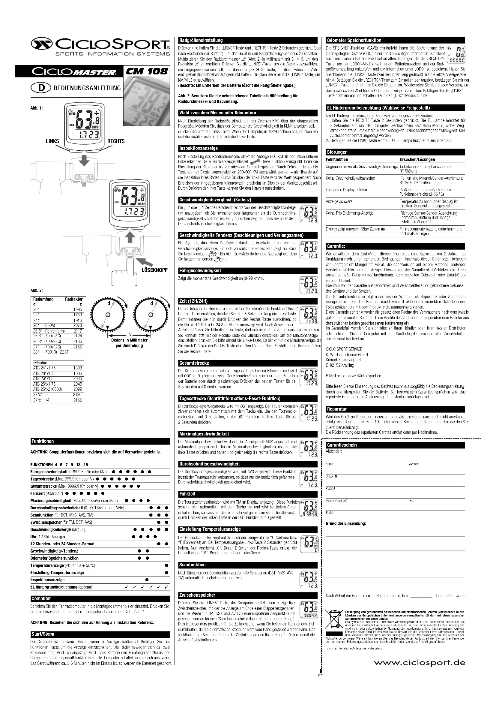 pendant 8 secondes ei l‘ordinateur passe en mode baiayage rapide et la distance de trajet, la vitesse maximale, a vitesse moyenne et le temporisateur s‘affichent une lois. 2. Appuyez une fois sur la buche de GAUCHEL‘eclairage EL s‘allume pendant 4 secondes. MauvaisFonctionnement ProplemesLecture de la vitesse maximale inexacte Interference atniosptiorique au fréquence radio inconnuePas d‘atflchage du compteur vitesse Alignement de l‘aimanl et de I‘émetteur incorrect. Vérffier lea piles et l’installationRetard dana le temps de réponse Temperature en dehors des timites deau niveau de raffichage fonctionnement (0-55 degres C)Ecran noir Temperature trop élevée ou ecran trop longtempa exposé a a Iumière directe du soleilPas daffichage de la distance parcourue Verifier lalignement du capteur et de Iairnant Verifier los piles et l’installationAffichage des chiffres irrégulier Retirer la pile de lordinateur at la reinstaller Garantie Nous accordons au 1er acheteur une garantie de 2 ans sur ce produit sous telles conditions. Dans ce délai, nous réparons sous garantie tout défaut prouvé de matériaux et de fabrication.Exclus de cette garantie sont les dommages dus à l´usage inapproprié , commercial ou accidentel. Les pièces d´usure, le boîtier cassé de l´appareil et l´émetteur ne sont pas sous garantie non plus.L´indemnisation garantie se fait selon notre choix par réparation ou échange des pièces endommagées. La garantie ne couvre aucun dommage direct ou indirect qui est en rapport avec ce produit. Cette garantie ne réduit ni les droits légaux du consommateur d´après la loi de chaque nation, ni les droits du consommateur envers le commerçant, du contrat d´achat conclu entre les deux. Pour faire appel à la garantie, veuillez contacter votre revendeur ou votre distributeur local ou bien envoyer l’ordinateur et ses accessoires ainsi que la facture (date) sous plis affranchi au tarif en vigueur à l’adresse suivante :CICLO SPORT SERVICEK. W. Hochschorner GmbHKonrad-Zuse-Bogen 8D-82152 Krailling E-Mail: ciclo-service@ciclosport.de Avant de nous envoyer l’appareil, relisez attentivement la Notice d‘utilisation et vérifiez la pile. Si vous bénéficiez des droits de garantie, nous vous renverrons l’appareil réparé ou nous vous le remplacerons. Réparation Si vous nous envoyez l’appareil à réparer ou si la garantie n´est pas acceptée, une réparation jusqu’à EUR 19,-- sera faite automatiquement.L’appareil réparer vous sera envoyé par remboursement. GarantiescheinExpéditeur :Nom PrénomNuméro, rue Code postal / VilleTéléphone ( durant la journée ) Fax Adresse MailRaison de l‘envoi: