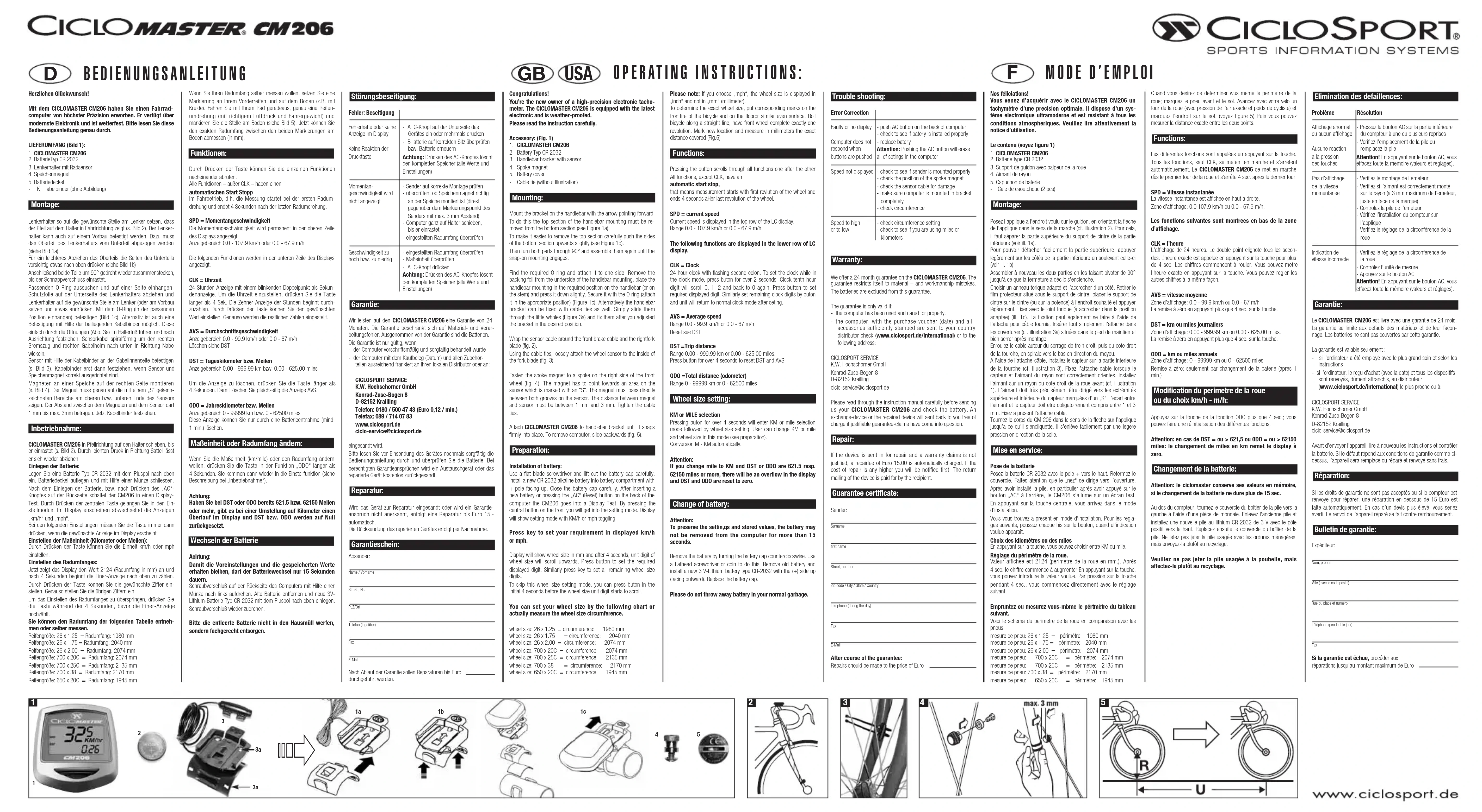 Elimination des defaillences: Problème RésolutionAffichage anormalou aucun affichageAucune reactiona la pression des touchesPas d’affichage de la vitessemomentaneeIndication de vitesse incorrecte Garantie: Le CICLOMASTER CM206 est livré avec une garantie de 24 mois. La garantie se limite aux défauts des matériaux et de leur façon-nage. Les batteries ne sont pas couvertes par cette garantie.La garantie est valable seulement : - si l’ordinateur a été employé avec le plus grand soin et selon les instructions- si l’ordinateur, le reçu d’achat (avec la date) et tous les dispositifssont renvoyés, dûment affranchis, au distributeur(www.ciclosport.de/international) le plus proche ou à:CICLOSPORT SERVICEK.W. Hochschorner GmbH Konrad-Zuse-Bogen 8D-82152 Kraillingciclo-service@ciclosport.deAvant d’envoyer l’appareil, lire à nouveau les instructions et contrôlerla batterie. Si le défaut répond aux conditions de garantie comme ci-dessus, l’appareil sera remplacé ou réparé et renvoyé sans frais. Réparation: Si les droits de garantie ne sont pas acceptés ou si le compteur estrenvoye pour réparer, une réparation en-dessous de 15 Euro estfaite automatiquement. En cas d’un devis plus élevé, vous seriezaverti. Le renvoi de l’appareil réparé se fait contre remboursement. Bulletin de garantie: Expéditeur:Nom, prénomVille (avec le code postal)Rue ou place et numéro Téléphone (pendant le jour) Fax Si la garantie est échue, procéder aux réparations jusqu’au montant maximum de Euro