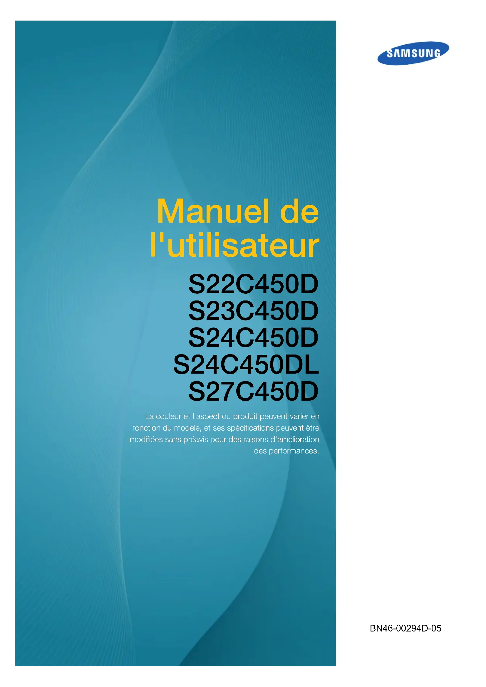 Manuel de l'utilisateur S22C450D S23C450D S24C450D S24C450DL S27C450D La couleur et l'aspect du produit peuvent varier en fonction du modèle, et ses spécifications peuvent être modifiées sans préavis pour des raisons d'amélioration des performances. BN46-00294D-05Table des matières
