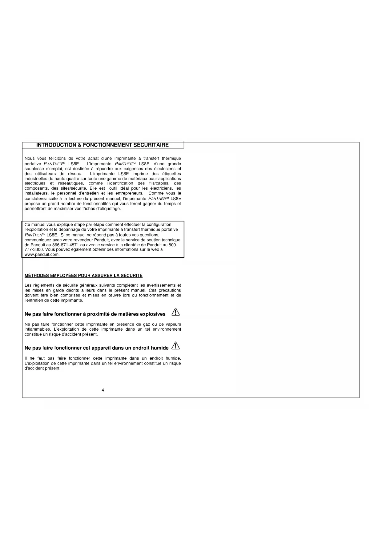Ce manuel vous explique étape par étape comment effectuer la configuration, l'exploitation et le dépannage de votre imprimante à transfert thermique portative PANTHER™ LS8E. Si ce manuel ne répond pas à toutes vos questions, communiquez avec votre revendeur Panduit, avec le service de soutien technique de Panduit au 866-871-4571 ou avec le service à la clientèle de Panduit au 800- 777-3300. Vous pouvez également obtenir des informations sur le web à www.panduit.com.