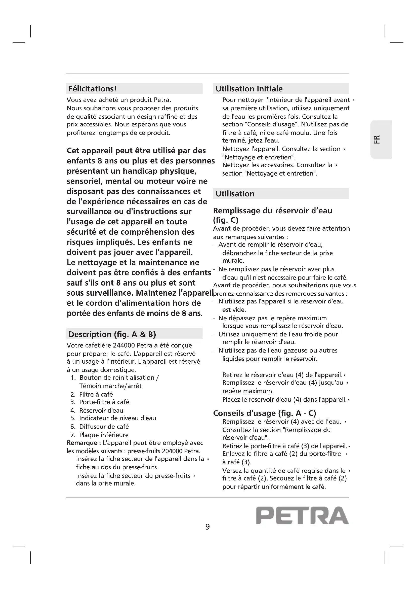 Félicitations! Vous avez acheté un produit Petra. Nous souhaitons vous proposer des produits de qualité associant un design raffiné et des prix accessibles. Nous espérons que vous profiterez longtemps de ce produit. Cet appareil peut être utilisé par des enfants 8 ans ou plus et des personnes présentant un handicap physique, sensoriel, mental ou moteur voire ne disposant pas des connaissances et de l'expérience nécessaires en cas de surveillance ou d'instructions sur l'usage de cet appareil en toute sécurité et de compréhension des risques impliqués. Les enfants ne doivent pas jouer avec l'appareil. Le nettoyage et la maintenance ne doivent pas être confiés à des enfants sauf s'ils ont 8 ans ou plus et sont sous surveillance. Maintenez l'appareil et le cordon d'alimentation hors de portée des enfants de moins de 8 ans. Description (fig. A & B) Votre cafetière 244000 Petra a été conçue pour préparer le café. L'appareil est réservé à un usage à l'intérieur. L'appareil est réservé à un usage domestique.