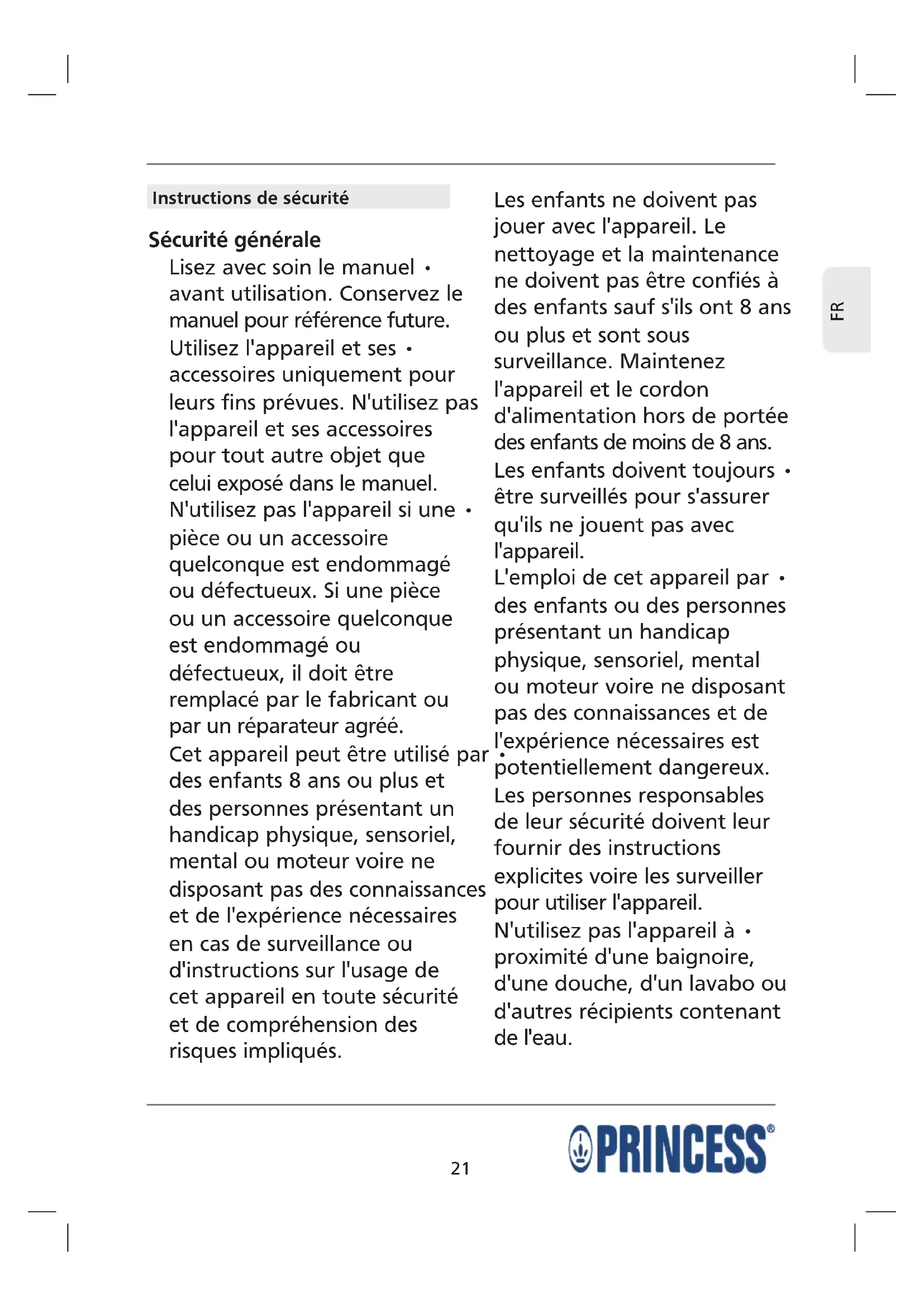 Instructions de sécurité Sécurité générale Lisez avec soin le manuel • avant utilisation. Conservez le manuel pour référence future. Utilisez l'appareil et ses • accessoires uniquement pour leurs fins prévues. N'utilisez pas l'appareil et ses accessoires pour tout autre objet que celui exposé dans le manuel. N'utilisez pas l'appareil si une • pièce ou un accessoire quelconque est endommagé ou défectueux. Si une pièce ou un accessoire quelconque est endommagé ou défectueux, il doit être remplacé par le fabricant ou par un réparateur agréé. Cet appareil peut être utilisé par • des enfants 8 ans ou plus et des personnes présentant un handicap physique, sensoriel, mental ou moteur voire ne disposant pas des connaissances et de l'expérience nécessaires en cas de surveillance ou d'instructions sur l'usage de cet appareil en toute sécurité et de compréhension des risques impliqués. Les enfants ne doivent pas jouer avec l'appareil. Le nettoyage et la maintenance ne doivent pas être confiés à des enfants sauf s'ils ont 8 ans ou plus et sont sous surveillance. Maintenez l'appareil et le cordon d'alimentation hors de portée des enfants de moins de 8 ans. Les enfants doivent toujours • être surveillés pour s'assurer qu'ils ne jouent pas avec l'appareil. L'emploi de cet appareil par • des enfants ou des personnes présentant un handicap physique, sensoriel, mental ou moteur voire ne disposant pas des connaissances et de l'expérience nécessaires est potentiellement dangereux. Les personnes responsables de leur sécurité doivent leur fournir des instructions explicites voire les surveiller pour utiliser l'appareil. N'utilisez pas l'appareil à • proximité d'une baignoire, d'une douche, d'un lavabo ou d'autres récipients contenant de l'eau.22