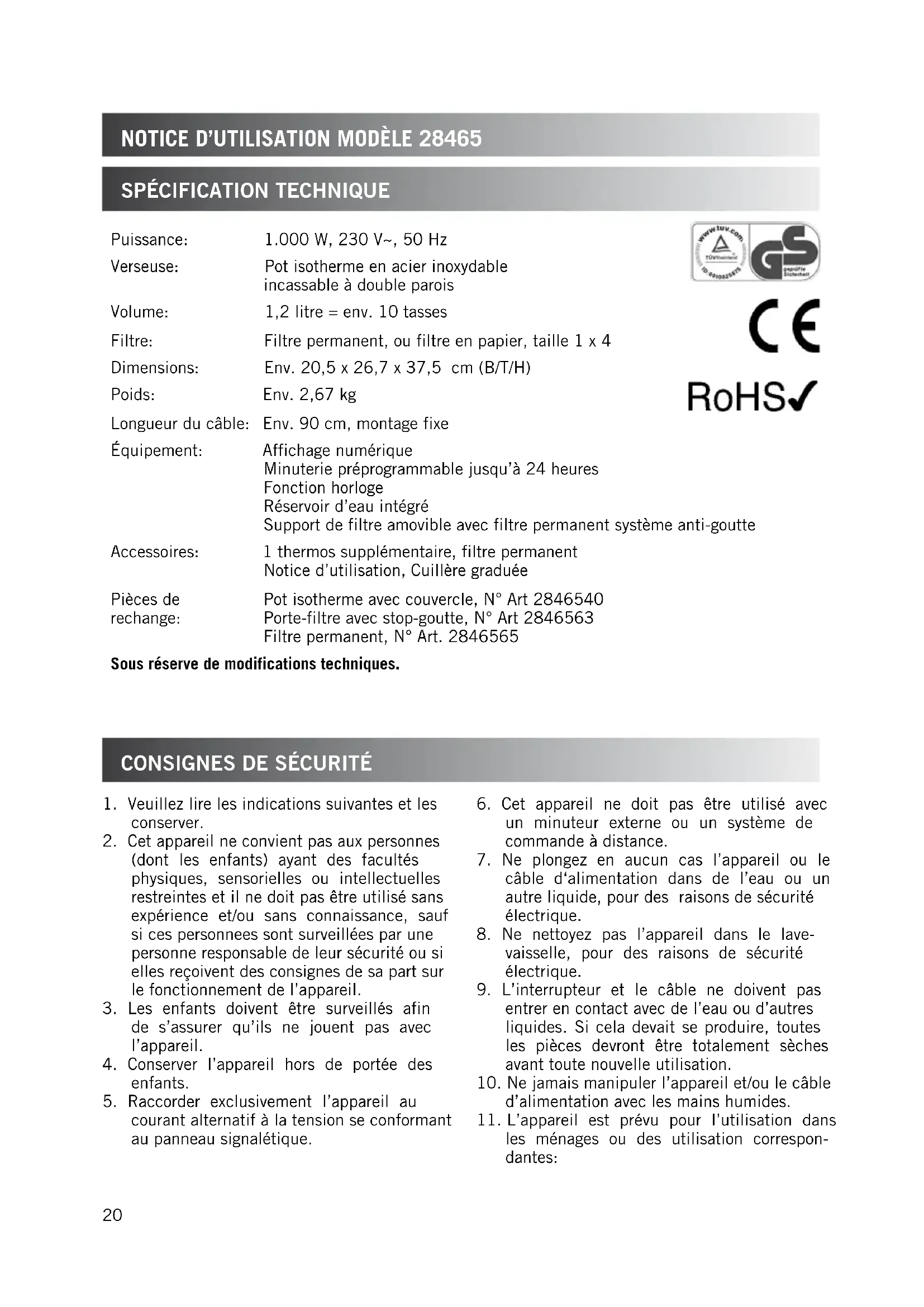 les ménages ou des utilisation correspon- dantes: Puissance: 1.000 W, 230 V~, 50 Hz Verseuse: Pot isotherme en acier inoxydable incassable à double parois Volume: 1,2 litre = env. 10 tasses Filtre: Filtre permanent, ou filtre en papier, taille 1 x 4 Dimensions: Env. 20,5 x 26,7 x 37,5 cm (B/T/H) Poids: Env. 2,67 kg Longueur du câble: Env. 90 cm, montage fixe Équipement: Affichage numérique Minuterie préprogrammable jusqu’à 24 heures Fonction horloge Réservoir d’eau intégré Support de filtre amovible avec filtre permanent système anti-goutte Accessoires: 1 thermos supplémentaire, filtre permanent Notice d’utilisation, Cuillère graduée Pièces de rechange: Pot isotherme avec couvercle, N° Art 2846540 Porte-filtre avec stop-goutte, N° Art 2846563 Filtre permanent, N° Art. 2846565 Sous réserve de modifications techniques.21 conseils pour un café parfait cuisines dans les magasins, les bureaux ou d’autres endroits de travail; fermes; par clients dans des hotels, motels et d’autres institutions d’hébergements; hébergement comme bed and breakfast/ pensions.