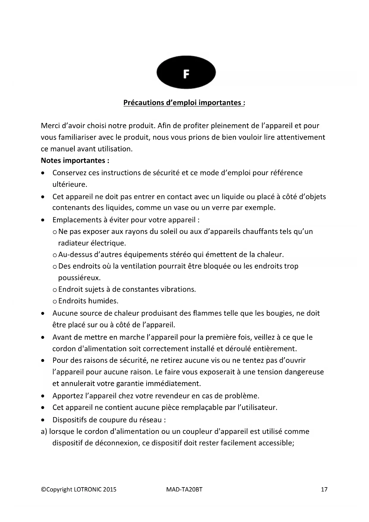 REVENDEUR EN CAS DE PROBLEME. TENSION DANGEREUSE : L’éclair dans le triangle attire l’attention sur un danger physique (due à une électrocution p.ex.). ATTENTION : Le point d’exclamation dans le triangle indique un risque dans la manipulation ou l’utilisation de l’appareil. ATTENTION : POUR EVITER QUE L’APPREIL DE PRENNE FEU OU TOUT AUTRE PROBLEME MAJEUR, N’EXPOSEZ L’APPAREIL A AUCUN LIQUIDE OU ECLABOUSSURES POSSIBLES. NOTE : Après un certain temps, l’appareil deviendra chaud. Ne vous inquiétez pas, ceci est normal et ne montre aucun problème venant de l’appareil. Ce produit est conforme à la norme CE-LVD directive : EN60065 PRECAUTIONS D’EMPLOI GENERALES : Ce qu’il faut « faire » et « ne pas faire » pour une utilisation sécurisée de l’appareil: Cet équipement a été conçu et fabriqué pour respecter les normes internationales de sécurité, mais comme tout appareil électrique, il faut être prudent si vous voulez en tirer les meilleurs résultats et une utilisation la plus sûre possible. LIRE le mode d’emploi avant la première utilisation. ASSUREZ-VOUS que toutes les connexions électriques (y compris les prises secteur, les rallonges etc.) sont en bon état et correspondent aux instructions du fabricant. ETEIGNEZ ET DEBRANCHEZ l’appareil de la prise secteur avant d’établir ou de modifier toute connexion à l’appareil.©Copyright LOTRONIC 2015 MAD-TA20BT 19 CONSULTEZ votre revendeur si vous avez un doute concernant l’installation, les instructions à suivre ou sur la sécurité de votre appareil. NE PAS ouvrir l’appareil par risque de vous exposer à une tension dangereuse et potentiellement mortelle. NE PAS surchauffer l’appareil par risque de l’endommager et de raccourcir sa durée de vie. NE PAS poser de récipients remplis de liquides tels que des verres ou des vases, sur ou à proximité immédiate de l’appareil. Ils risquent de tomber et de déverser le liquide dans l’appareil. Ne jamais verser de liquides au-dessus de l’appareil. NE PAS placer de flamme ouverte telle qu’une bougie sur ou à côté de l’appareil. Les hautes températures peuvent causer la fonte du plastique et provoquer des incendies. NE PAS écouter la musique à un volume trop élevé par risque d’endommager votre ouïe. NE PAS laisser l’appareil sans surveillance lorsqu’il est sous tension. Eteignez le système à l’aide de l’interrupteur. NE PAS continuer d’utiliser l’appareil si vous êtes dans un doute concernant son bon fonctionnement. Éteignez-le et débranchez-le de la prise secteur et consultez votre revendeur immédiatement. Remarque: En cas de dysfonctionnement dû à l’électricité électrostatique, éteignez simplement le système pendant 5 minutes. Rebranchez pour reprendre une utilisation normale. NOTE : NE PAS OUVRIR l’appareil afin d’essayer de le réparer soi-même. Une personne qualifiée doit s’en charger. Contenu de l’emballage: