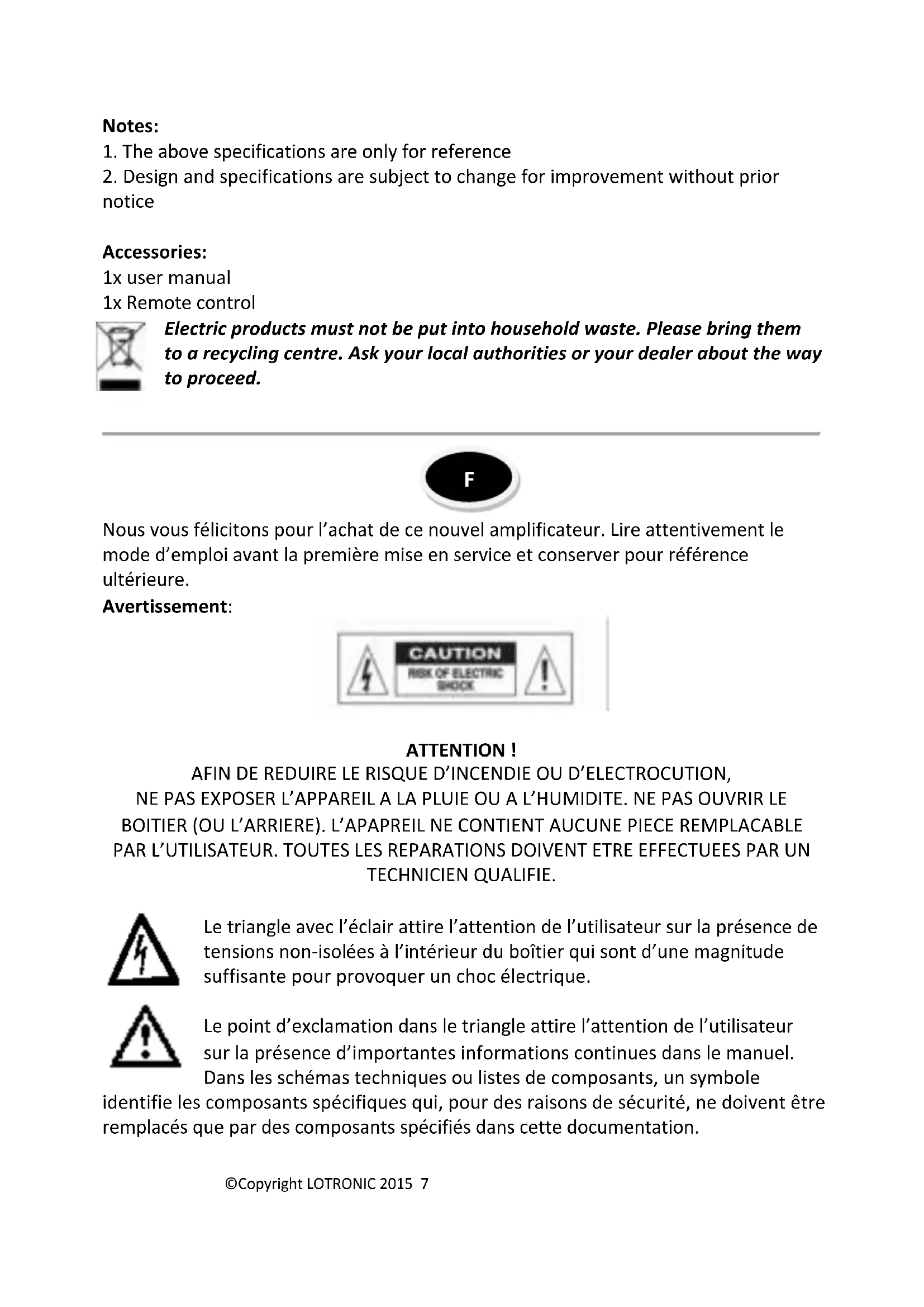 ATTENTION ! AFIN DE REDUIRE LE RISQUE D’INCENDIE OU D’ELECTROCUTION, NE PAS EXPOSER L’APPAREIL A LA PLUIE OU A L’HUMIDITE. NE PAS OUVRIR LE BOITIER (OU L’ARRIERE). L’APAPREIL NE CONTIENT AUCUNE PIECE REMPLACABLE PAR L’UTILISATEUR. TOUTES LES REPARATIONS DOIVENT ETRE EFFECTUEES PAR UN TECHNICIEN QUALIFIE. Le triangle avec l’éclair attire l’attention de l’utilisateur sur la présence de tensions non-isolées à l’intérieur du boîtier qui sont d’une magnitude suffisante pour provoquer un choc électrique. Le point d’exclamation dans le triangle attire l’attention de l’utilisateur sur la présence d’importantes informations continues dans le manuel. Dans les schémas techniques ou listes de composants, un symbole identifie les composants spécifiques qui, pour des raisons de sécurité, ne doivent être remplacés que par des composants spécifiés dans cette documentation. F©Copyright LOTRONIC 2015 8