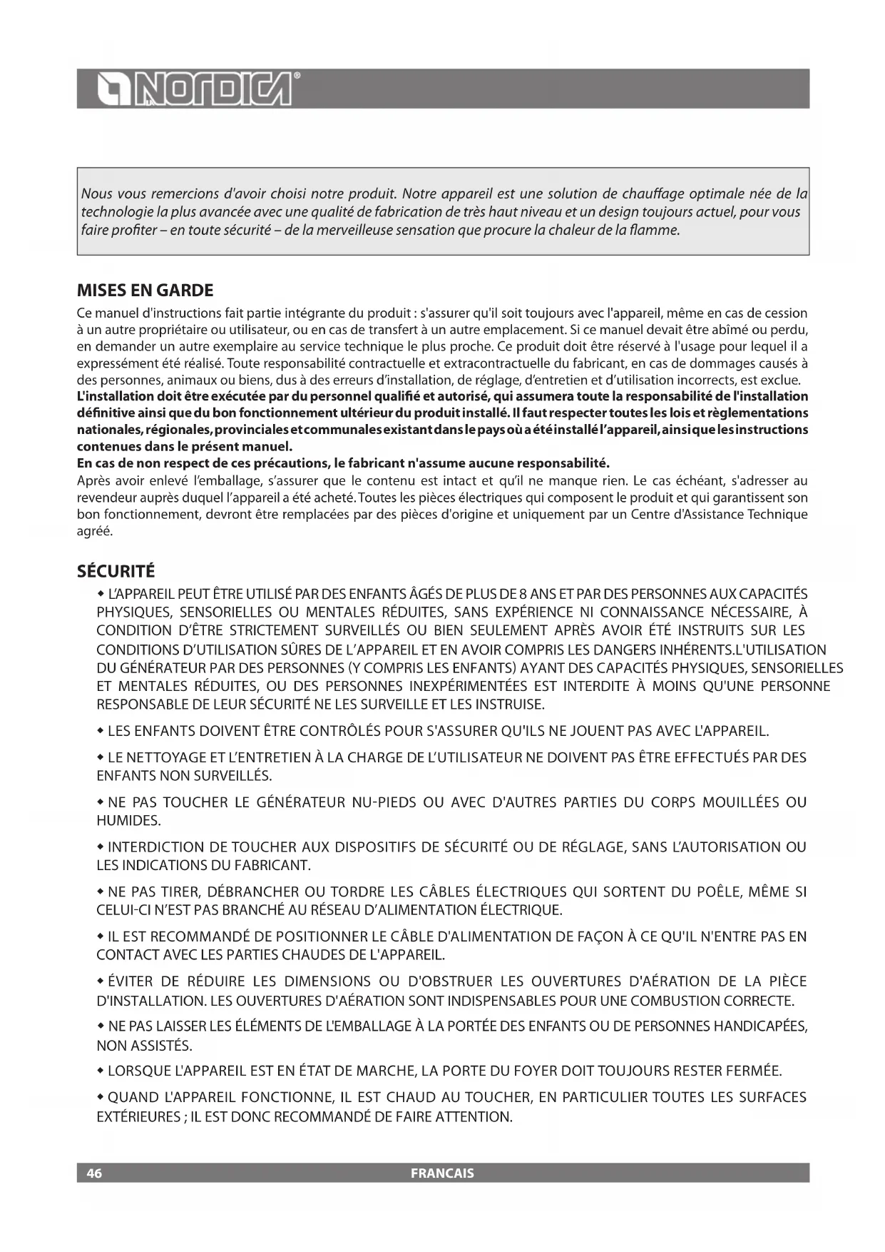 Ce manuel d'instructions fait partie intégrante du produit: s'assurer qu'il soit toujours avec l'appareil, même en cas de cession à un autre propriétaire ou utilisateur, ou en cas de transfert à un autre emplacement. Si ce manuel devait être abîmé ou perdu, en demander un autre exemplaire au service technique le plus proche. Ce produit doit être réservé à l'usage pour lequel il a expressément été réalisé. Toute responsabilité contractuelle et extracontractuelle du fabricant, en cas de dommages causés à des personnes, animaux ou biens, dus à des erreurs d’installation, de réglage, d’entretien et d’utilisation incorrects, est exclue. L'installation doit être exécutée par du personnel qualié et autorisé, qui assumera toute la responsabilité de l'installation dénitive ainsi que du bon fonctionnement ultérieur du produit installé. Il faut respecter toutes les lois et règlementations nationales, régionales, provinciales et communales existant dans le pays où a été installé l’appareil, ainsi que les instructions contenues dans le présent manuel. En cas de non respect de ces précautions, le fabricant n'assume aucune responsabilité. Après avoir enlevé l’emballage, s’assurer que le contenu est intact et qu’il ne manque rien. Le cas échéant, s'adresser au revendeur auprès duquel l’appareil a été acheté. Toutes les pièces électriques qui composent le produit et qui garantissent son bon fonctionnement, devront être remplacées par des pièces d'origine et uniquement par un Centre d'Assistance Technique agréé. SÉCURITÉ L’APPAREIL PEUT ÊTRE UTILISÉ PAR DES ENFANTS ÂGÉS DE PLUS DE 8 ANS ET PAR DES PERSONNES AUX CAPACITÉS PHYSIQUES, SENSORIELLES OU MENTALES RÉDUITES, SANS EXPÉRIENCE NI CONNAISSANCE NÉCESSAIRE, À CONDITION D’ÊTRE STRICTEMENT SURVEILLÉS OU BIEN SEULEMENT APRÈS AVOIR ÉTÉ INSTRUITS SUR LES CONDITIONS D’UTILISATION SÛRES DE L’APPAREIL ET EN AVOIR COMPRIS LES DANGERS INHÉRENTS.L'UTILISATION DU GÉNÉRATEUR PAR DES PERSONNES (Y COMPRIS LES ENFANTS) AYANT DES CAPACITÉS PHYSIQUES, SENSORIELLES ET MENTALES RÉDUITES, OU DES PERSONNES INEXPÉRIMENTÉES EST INTERDITE À MOINS QU'UNE PERSONNE RESPONSABLE DE LEUR SÉCURITÉ NE LES SURVEILLE ET LES INSTRUISE. LES ENFANTS DOIVENT ÊTRE CONTRÔLÉS POUR S'ASSURER QU'ILS NE JOUENT PAS AVEC L'APPAREIL. LE NETTOYAGE ET L’ENTRETIEN À LA CHARGE DE L’UTILISATEUR NE DOIVENT PAS ÊTRE EFFECTUÉS PAR DES ENFANTS NON SURVEILLÉS. NE PAS TOUCHER LE GÉNÉRATEUR NU-PIEDS OU AVEC D'AUTRES PARTIES DU CORPS MOUILLÉES OU HUMIDES. INTERDICTION DE TOUCHER AUX DISPOSITIFS DE SÉCURITÉ OU DE RÉGLAGE, SANS L’AUTORISATION OU LES INDICATIONS DU FABRICANT. NE PAS TIRER, DÉBRANCHER OU TORDRE LES CÂBLES ÉLECTRIQUES QUI SORTENT DU POÊLE, MÊME SI CELUI-CI N’EST PAS BRANCHÉ AU RÉSEAU D’ALIMENTATION ÉLECTRIQUE. IL EST RECOMMANDÉ DE POSITIONNER LE CÂBLE D'ALIMENTATION DE FAÇON À CE QU'IL N'ENTRE PAS EN CONTACT AVEC LES PARTIES CHAUDES DE L'APPAREIL. ÉVITER DE RÉDUIRE LES DIMENSIONS OU D'OBSTRUER LES OUVERTURES D'AÉRATION DE LA PIÈCE D'INSTALLATION. LES OUVERTURES D'AÉRATION SONT INDISPENSABLES POUR UNE COMBUSTION CORRECTE. NE PAS LAISSER LES ÉLÉMENTS DE L'EMBALLAGE À LA PORTÉE DES ENFANTS OU DE PERSONNES HANDICAPÉES, NON ASSISTÉS. LORSQUE L'APPAREIL EST EN ÉTAT DE MARCHE, LA PORTE DU FOYER DOIT TOUJOURS RESTER FERMÉE. QUAND L'APPAREIL FONCTIONNE, IL EST CHAUD AU TOUCHER, EN PARTICULIER TOUTES LES SURFACES EXTÉRIEURES; IL EST DONC RECOMMANDÉ DE FAIRE ATTENTION. 46FRANCAIS CONTRÔLER LA PRÉSENCE ÉVENTUELLE D’OBSTRUCTIONS AVANT D’ALLUMER UN APPAREIL APRÈS UNE LONGUE PÉRIODE D’INACTIVITÉ. LE GÉNÉRATEUR A ÉTÉ CONÇU POUR ÊTRE UTILISÉ DANS N’IMPORTE QUELLE CONDITION CLIMATIQUE. CEPENDANT, EN CAS DE CLIMAT PARTICULIÈREMENT DÉFAVORABLE VENT FORT, GEL, LES SYSTÈMES DE SÉCURITÉ POURRAIENT SE DÉCLENCHER, PROVOQUANT AINSI L’ARRÊT DU GÉNÉRATEUR. SI CELA SE VÉRIFIE, CONTACTER LE SERVICE D’ASSISTANCE TECHNIQUE ET SURTOUT NE PAS DÉSACTIVER LES SYSTÈMES DE SÉCURITÉ. EN CAS D'INCENDIE DU CONDUIT DE FUMÉE, SE MUNIR D'EXTINCTEURS POUR ÉTOUFFER LES FLAMMES OU APPELER LES POMPIERS. CET APPAREIL NE DOIT PAS ÊTRE UTILISÉ COMME INCINÉRATEUR DE DÉCHETS.
