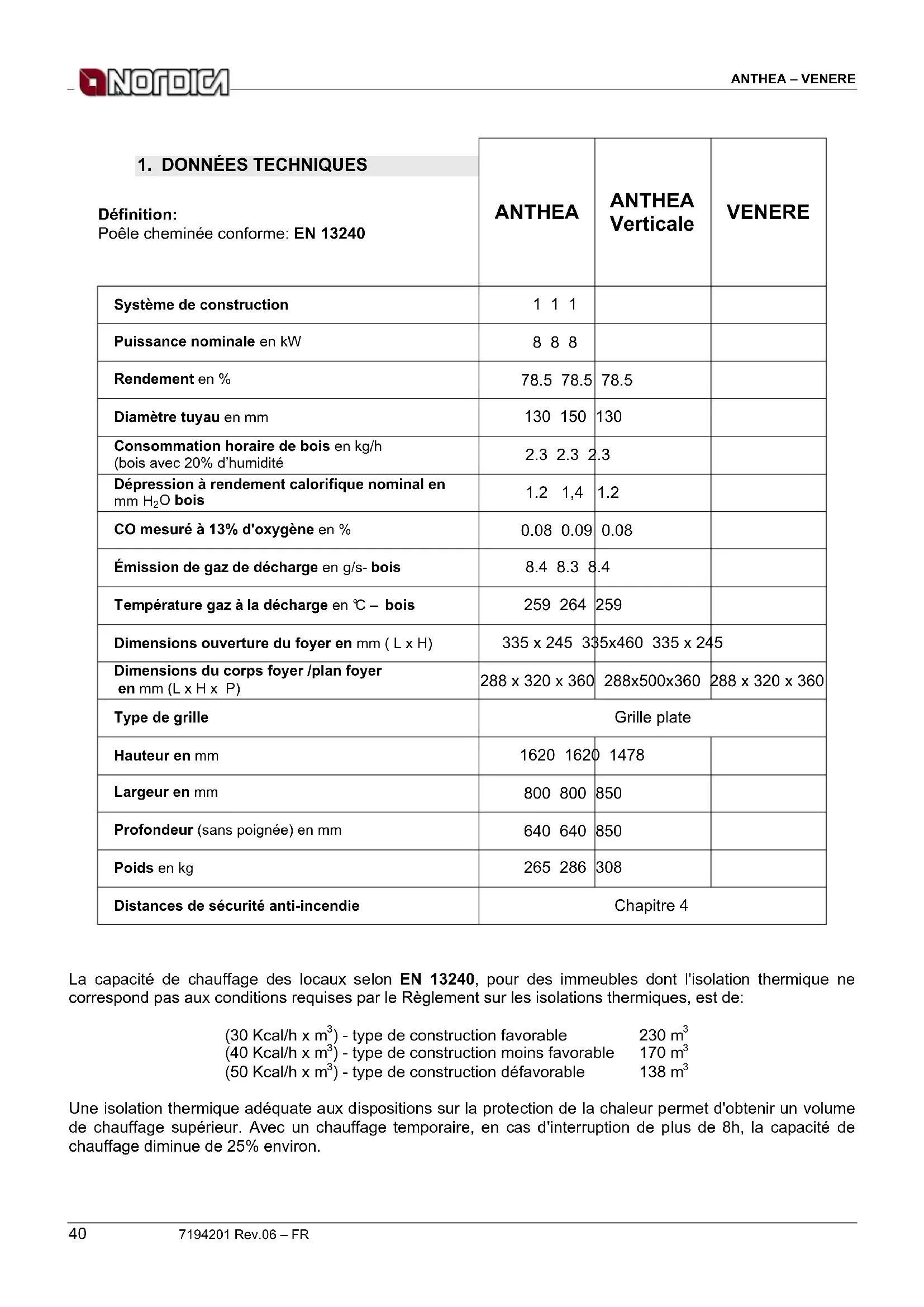 | 1. DONNÉES TECHNIQUESDéfinition:Poèle cheminée conforme: EN 13240 | ANTHEA | ANTHEAVertical | VENERE |