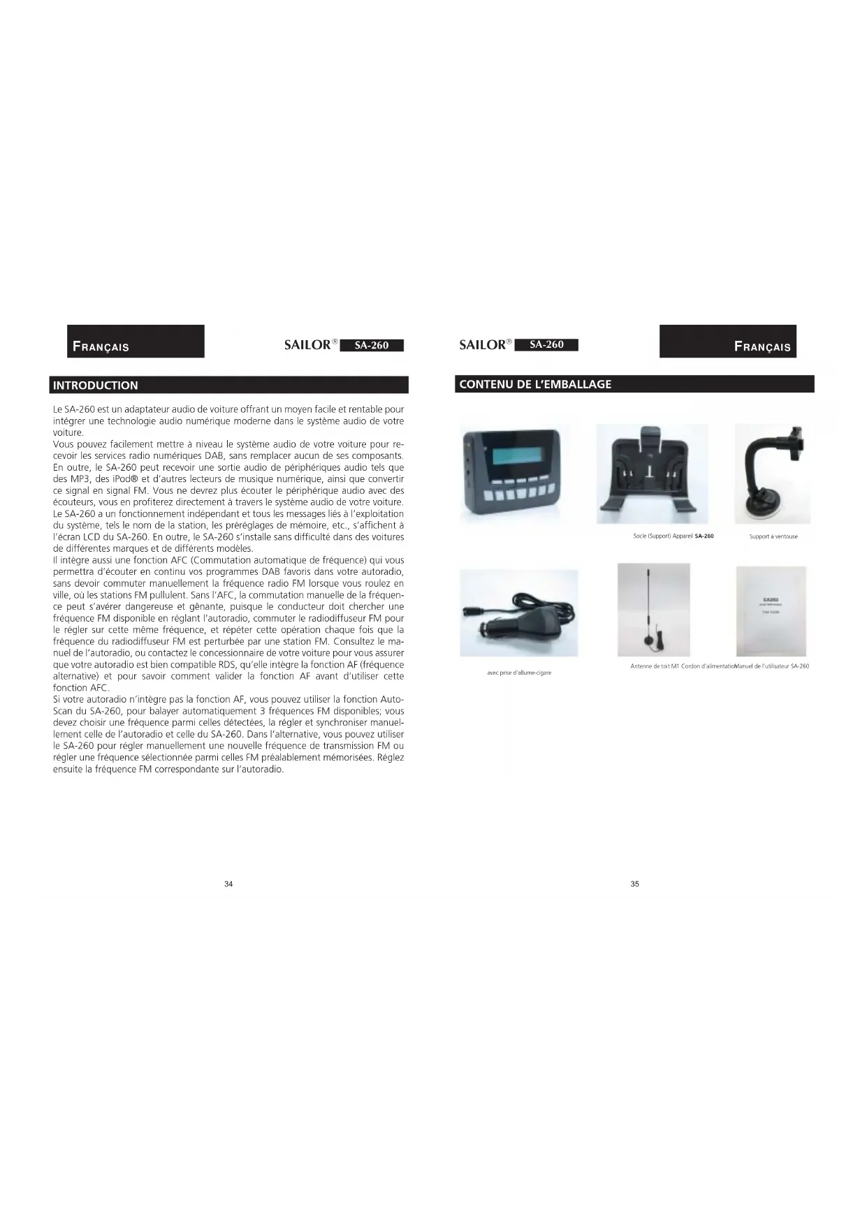 Socle (Support) Appareil SA-260 Antenne de toit M1 Cordon d’alimentationavec prise d’allume-cigare Support à ventouseManuel de l’utilisateur SA-260FRANÇAIS